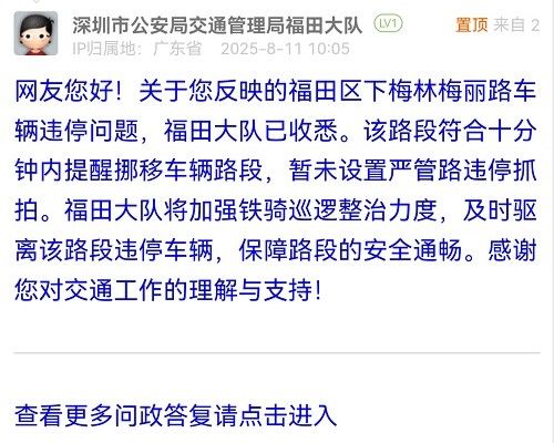 網(wǎng)友您好!關(guān)于您反映的福田區(qū)下梅林梅麗路車輛違停問(wèn)題,福田大隊(duì)已收悉。該路段符合十分鐘內(nèi)提醒挪移車輛路段,暫未設(shè)置嚴(yán)管路違停抓拍。福田大隊(duì)將加強(qiáng)鐵騎巡邏整治力度,及時(shí)驅(qū)離該路段違停車輛,保障路段的安全通暢。感謝您對(duì)交通工作的理解與支持!