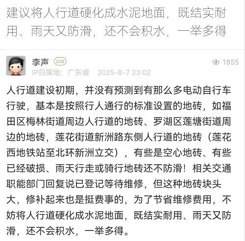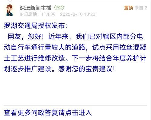 網(wǎng)友,您好!近年來(lái),我們已對(duì)轄區(qū)內(nèi)部分電動(dòng)自行車通行量較大的道路,試點(diǎn)采用拉絲混凝土工藝進(jìn)行維修改造。下一步將結(jié)合年度養(yǎng)護(hù)計(jì)劃逐步推廣建設(shè)。感謝您的寶貴建議!