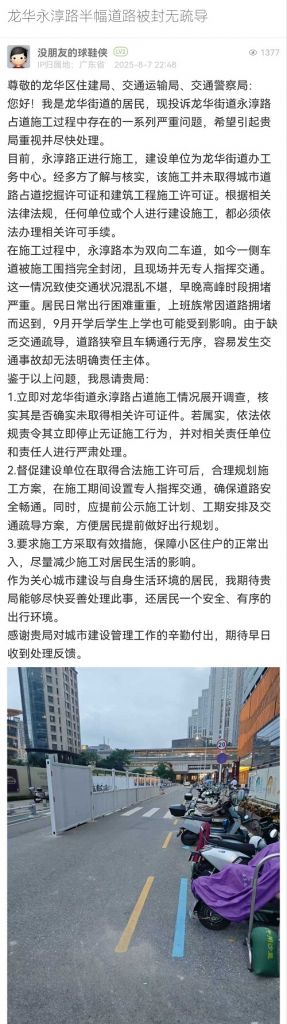 20. 帖文《龍華永淳路半幅道路被封無(wú)疏導(dǎo)》