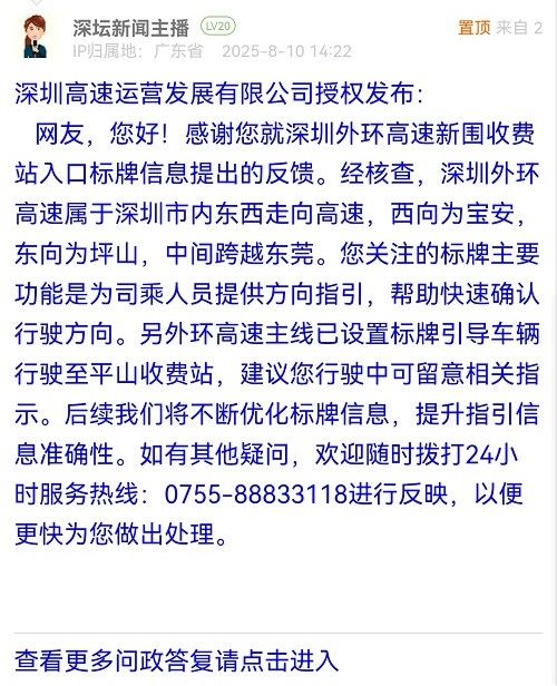 網(wǎng)友,您好!感謝您就深圳外環(huán)高速新圍收費(fèi)站入口標(biāo)牌信息提出的反饋。經(jīng)核查,深圳外環(huán)高速屬于深圳市內(nèi)東西走向高速,西向?yàn)閷毎?,東向?yàn)槠荷剑虚g跨越東莞。您關(guān)注的標(biāo)牌主要功能是為司乘人員提供方向指引,幫助快速確認(rèn)行駛方向。另外環(huán)高速主線已設(shè)置標(biāo)牌引導(dǎo)車輛行駛至平山收費(fèi)站,建議您行駛中可留意相關(guān)指示。后續(xù)我們將不斷優(yōu)化標(biāo)牌信息,提升指引信息準(zhǔn)確性。如有其他疑問(wèn),歡迎隨時(shí)撥打24小時(shí)服務(wù)熱線:0755-88833118進(jìn)行反映,以便更快為您做出處理。