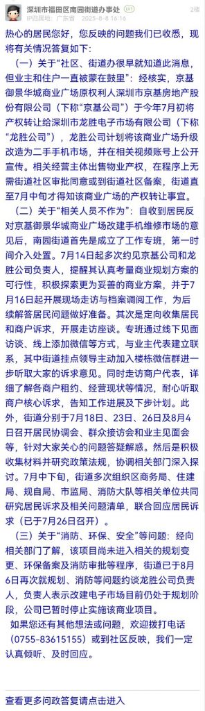 (二)關(guān)于“相關(guān)人員不作為”:自收到居民反對(duì)京基御景華城商業(yè)廣場(chǎng)改建手機(jī)維修市場(chǎng)的意見(jiàn)后,南園街道首先是成立了工作專班,第一時(shí)間介入處置。7月14日起多次約見(jiàn)京基公司和龍勝公司負(fù)責(zé)人,提醒其認(rèn)真考量商業(yè)規(guī)劃方案的可行性,積極探索更為妥善的商業(yè)方案,并于7月16日起開展現(xiàn)場(chǎng)走訪與檔案調(diào)閱工作,為后續(xù)解答居民問(wèn)題做好準(zhǔn)備。其次是定向收集居民和商戶訴求,開展走訪座談。專班通過(guò)線下見(jiàn)面訪談、線上添加微信等方式,與業(yè)主代表建立聯(lián)系,其中街道掛點(diǎn)領(lǐng)導(dǎo)主動(dòng)加入樓棟微信群進(jìn)一步聽取大家的訴求意見(jiàn)。同時(shí)走訪商戶代表,詳細(xì)了解各商戶租約、經(jīng)營(yíng)現(xiàn)狀等情況,耐心聽取商戶核心訴求,告知工作進(jìn)展及下步計(jì)劃。此外,街道分別于7月18日、23日、26日及8月4日召開居民協(xié)調(diào)會(huì)、群眾接訪會(huì)和業(yè)主見(jiàn)面會(huì)等,針對(duì)大家關(guān)心的問(wèn)題答疑解惑。然后是積極收集材料并研究政策法規(guī),協(xié)調(diào)相關(guān)部門深入探討。7月中下旬,街道多次組織區(qū)商務(wù)局、住建局、規(guī)自局、市監(jiān)局、消防大隊(duì)等相關(guān)單位共同研究居民訴求及相關(guān)問(wèn)題清單,聯(lián)合回應(yīng)居民訴求(已于7月26日召開)。