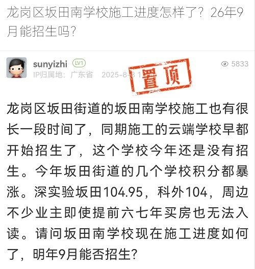 23. 帖文《龍崗區(qū)坂田南學(xué)校施工進(jìn)度怎樣了?26年9月能招生嗎?》