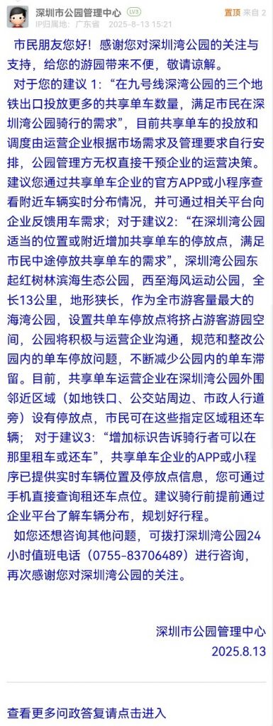 對(duì)于您的建議 1:“在九號(hào)線深灣公園的三個(gè)地鐵出口投放更多的共享單車數(shù)量,滿足市民在深圳灣公園騎行的需求”,目前共享單車的投放和調(diào)度由運(yùn)營(yíng)企業(yè)根據(jù)市場(chǎng)需求及管理要求自行安排,公園管理方無(wú)權(quán)直接干預(yù)企業(yè)的運(yùn)營(yíng)決策。建議您通過(guò)共享單車企業(yè)的官方APP或小程序查看附近車輛實(shí)時(shí)分布情況,并可通過(guò)相關(guān)平臺(tái)向企業(yè)反饋用車需求;對(duì)于建議2:“在深圳灣公園適當(dāng)?shù)奈恢没蚋浇黾庸蚕韱诬嚨耐7劈c(diǎn),滿足市民中途停放共享單車的需求”,深圳灣公園東起紅樹林濱海生態(tài)公園,西至海風(fēng)運(yùn)動(dòng)公園,全長(zhǎng)13公里,地形狹長(zhǎng),作為全市游客量最大的海灣公園,設(shè)置共單車停放點(diǎn)將擠占游客游園空間,公園將積極與運(yùn)營(yíng)企業(yè)溝通,規(guī)范和整改公園內(nèi)的單車停放問(wèn)題,不斷減少公園內(nèi)的單車滯留。目前,共享單車運(yùn)營(yíng)企業(yè)在深圳灣公園外圍鄰近區(qū)域(如地鐵口、公交站周邊、市政人行道旁)設(shè)有停放點(diǎn),市民可在這些指定區(qū)域租還車輛; 對(duì)于建議3:“增加標(biāo)識(shí)告訴騎行者可以在那里租車或還車”,共享單車企業(yè)的APP或小程序已提供實(shí)時(shí)車輛位置及停放點(diǎn)信息,您可通過(guò)手機(jī)直接查詢租還車點(diǎn)位。建議騎行前提前通過(guò)企業(yè)平臺(tái)了解車輛分布,規(guī)劃好行程。