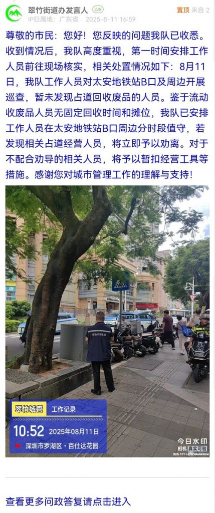 尊敬的市民:您好!您反映的問(wèn)題我隊(duì)已收悉。收到情況后,我隊(duì)高度重視,第一時(shí)間安排工作人員前往現(xiàn)場(chǎng)核實(shí),相關(guān)處置情況如下:8月11日,我隊(duì)工作人員對(duì)太安地鐵站B口及周邊開展巡查,暫未發(fā)現(xiàn)占道回收廢品的人員。鑒于流動(dòng)收廢品人員無(wú)固定回收時(shí)間和攤位,我隊(duì)已安排工作人員在太安地鐵站B口周邊分時(shí)段值守,若發(fā)現(xiàn)相關(guān)占道經(jīng)營(yíng)人員,將立即予以勸離。對(duì)于不配合勸導(dǎo)的相關(guān)人員,將予以暫扣經(jīng)營(yíng)工具等措施。感謝您對(duì)城市管理工作的理解與支持!