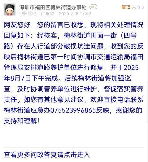 網(wǎng)友您好,您的留言已收悉,現(xiàn)將相關(guān)處理情況回復(fù)如下:經(jīng)核實(shí),梅林街道圍面一街(四號(hào)路)存在人行道部分破損坑洼問(wèn)題,收到您的反映后梅林街道已第一時(shí)間協(xié)調(diào)市交通運(yùn)輸局福田管理局安排道路養(yǎng)護(hù)單位進(jìn)行修復(fù),并于2025年8月7日下午完成。后續(xù)梅林街道將加強(qiáng)巡查,及時(shí)協(xié)調(diào)管養(yǎng)單位進(jìn)行維護(hù),督促落實(shí)管養(yǎng)責(zé)任。如您有其他意見(jiàn)建議,歡迎直接電話聯(lián)系梅林街道應(yīng)急辦075523996865反映,感謝您的支持和理解!