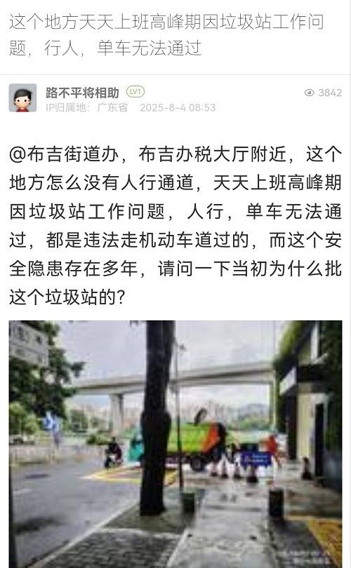 1. 帖文《這個(gè)地方天天上班高峰期因垃圾站工作問(wèn)題,行人,單車無(wú)法通過(guò)》