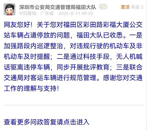 網(wǎng)友您好!關(guān)于您對(duì)福田區(qū)彩田路彩福大廈公交站車輛占道停放的問(wèn)題,福田大隊(duì)已收悉。一是加強(qiáng)路段內(nèi)巡邏整治,對(duì)違規(guī)行駛的機(jī)動(dòng)車及非機(jī)動(dòng)車及時(shí)提醒;二是通過(guò)科技手段,無(wú)人機(jī)喊話驅(qū)離違停車輛,同步開展批評(píng)教育;三是聯(lián)合交通局對(duì)客運(yùn)車輛進(jìn)行規(guī)范管理。感謝您對(duì)交通工作的理解與支持!