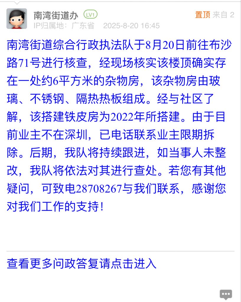 南灣街道綜合行政執(zhí)法隊(duì)于8月20日前往布沙路71號(hào)進(jìn)行核查,經(jīng)現(xiàn)場(chǎng)核實(shí)該樓頂確實(shí)存在一處約6平方米的雜物房,該雜物房由玻璃、不銹鋼、隔熱熱板組成。經(jīng)與社區(qū)了解,該搭建鐵皮房為2022年所搭建。由于目前業(yè)主不在深圳,已電話聯(lián)系業(yè)主限期拆除。后期,我隊(duì)將持續(xù)跟進(jìn),如當(dāng)事人未整改,我隊(duì)將依法對(duì)其進(jìn)行查處。若您有其他疑問(wèn),可致電28708267與我們聯(lián)系,感謝您對(duì)我們工作的支持!
