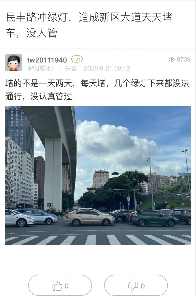 16. 帖文《民豐路沖綠燈,造成新區(qū)大道天天堵車,沒(méi)人管》