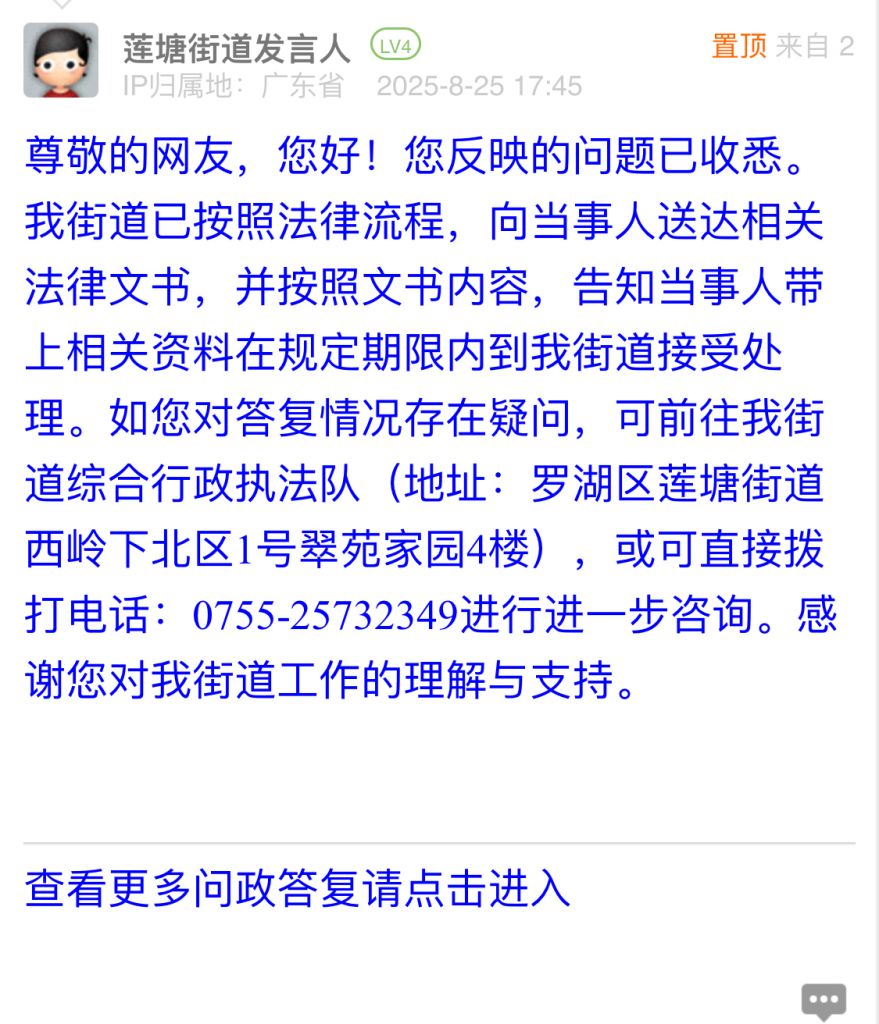 尊敬的網(wǎng)友,您好!您反映的問(wèn)題已收悉。我街道已按照法律流程,向當(dāng)事人送達(dá)相關(guān)法律文書(shū),并按照文書(shū)內(nèi)容,告知當(dāng)事人帶上相關(guān)資料在規(guī)定期限內(nèi)到我街道接受處理。如您對(duì)答復(fù)情況存在疑問(wèn),可前往我街道綜合行政執(zhí)法隊(duì)(地址:羅湖區(qū)蓮塘街道西嶺下北區(qū)1號(hào)翠苑家園4樓),或可直接撥打電話:0755-25732349進(jìn)行進(jìn)一步咨詢。感謝您對(duì)我街道工作的理解與支持。