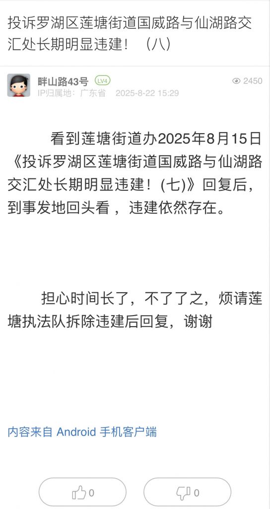 29. 帖文《投訴羅湖區(qū)蓮塘街道國(guó)威路與仙湖路交匯處長(zhǎng)期明顯違建!(八)》