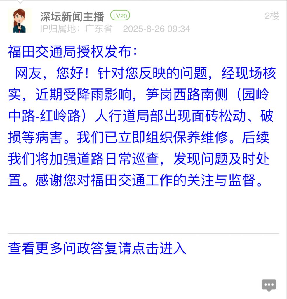 網(wǎng)友,您好!針對(duì)您反映的問(wèn)題,經(jīng)現(xiàn)場(chǎng)核實(shí),近期受降雨影響,筍崗西路南側(cè)(園嶺中路-紅嶺路)人行道局部出現(xiàn)面磚松動(dòng)、破損等病害。我們已立即組織保養(yǎng)維修。后續(xù)我們將加強(qiáng)道路日常巡查,發(fā)現(xiàn)問(wèn)題及時(shí)處置。感謝您對(duì)福田交通工作的關(guān)注與監(jiān)督。