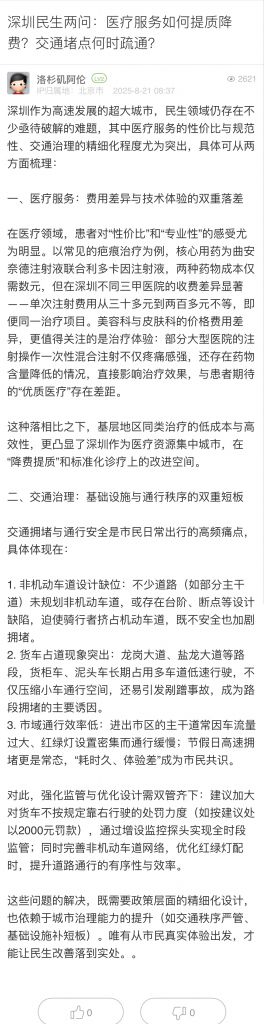 15. 帖文《深圳民生兩問(wèn):醫(yī)療服務(wù)如何提質(zhì)降費(fèi)?交通堵點(diǎn)何時(shí)疏通?》