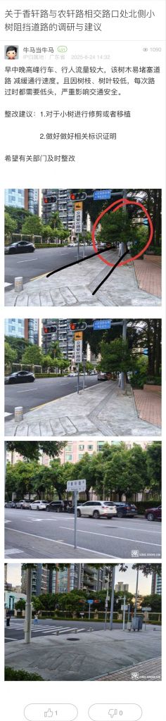 40. 帖文《關(guān)于香軒路與農(nóng)軒路相交路口處北側(cè)小樹(shù)阻擋道路的調(diào)研與建議》