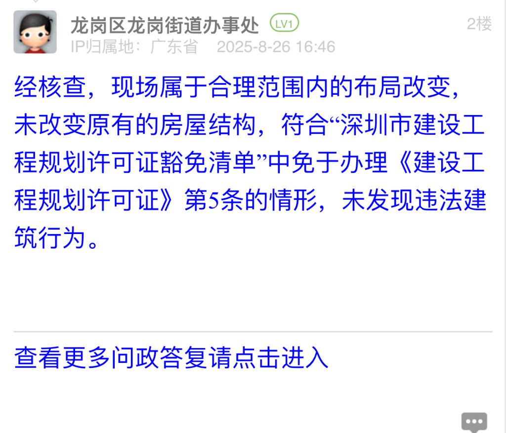 經(jīng)核查,現(xiàn)場(chǎng)屬于合理范圍內(nèi)的布局改變,未改變?cè)械姆课萁Y(jié)構(gòu),符合“深圳市建設(shè)工程規(guī)劃許可證豁免清單”中免于辦理《建設(shè)工程規(guī)劃許可證》第5條的情形,未發(fā)現(xiàn)違法建筑行為。