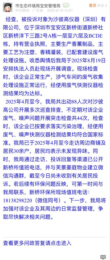 經(jīng)查,被投訴對(duì)象為沙彼高儀器(深圳)有限公司,位于深圳市寶安區(qū)新橋街道新橋社區(qū)新橋洋下三路2號(hào)A棟一層至六層及BCDE棟,持有營(yíng)業(yè)執(zhí)照,主要生產(chǎn)香薰制品,主要工藝為注塑、香精灌裝,已配套建設(shè)廢氣處理設(shè)施。收悉輿情后我局于2025年8月19日安排執(zhí)法人員赴現(xiàn)場(chǎng)開(kāi)展調(diào)查。現(xiàn)場(chǎng)檢查時(shí),該企業(yè)正常生產(chǎn),涉氣車間的廢氣收集處理設(shè)施正常運(yùn)行,經(jīng)使用廢氣快測(cè)儀器檢測(cè)結(jié)果均為達(dá)標(biāo)。
