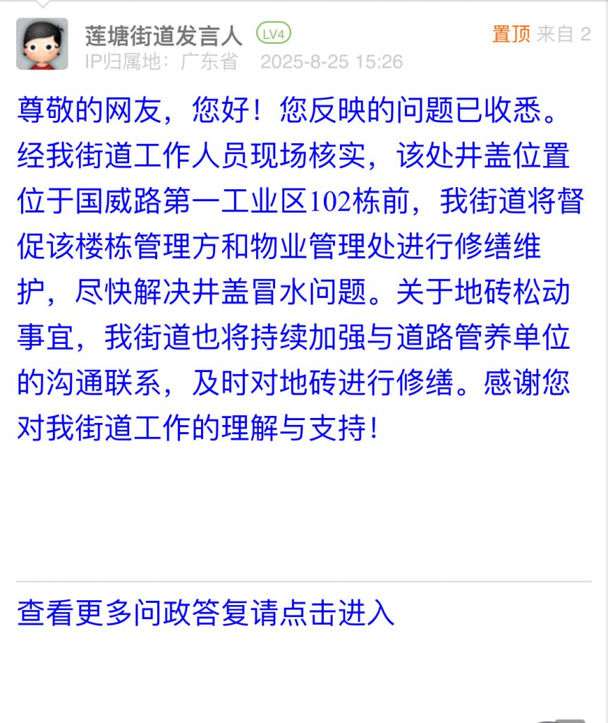尊敬的網(wǎng)友,您好!您反映的問(wèn)題已收悉。經(jīng)我街道工作人員現(xiàn)場(chǎng)核實(shí),該處井蓋位置位于國(guó)威路第一工業(yè)區(qū)102棟前,我街道將督促該樓棟管理方和物業(yè)管理處進(jìn)行修繕維護(hù),盡快解決井蓋冒水問(wèn)題。關(guān)于地磚松動(dòng)事宜,我街道也將持續(xù)加強(qiáng)與道路管養(yǎng)單位的溝通聯(lián)系,及時(shí)對(duì)地磚進(jìn)行修繕。感謝您對(duì)我街道工作的理解與支持!