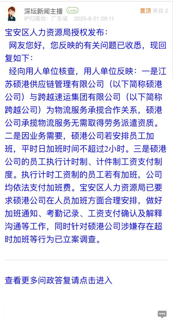 經(jīng)向用人單位核查,用人單位反映:一是江蘇碩港供應(yīng)鏈管理有限公司(以下簡(jiǎn)稱碩港公司)與跨越速運(yùn)集團(tuán)有限公司(以下簡(jiǎn)稱跨越公司)為物流服務(wù)承攬合作關(guān)系,碩港公司承攬物流服務(wù)無(wú)需取得勞務(wù)派遣資質(zhì)。二是因業(yè)務(wù)需要,碩港公司若安排員工加班,平時(shí)日加班時(shí)間不超過(guò)2小時(shí)。三是碩港公司的員工執(zhí)行計(jì)時(shí)制、計(jì)件制工資支付制度。執(zhí)行計(jì)時(shí)工資制的員工若有加班,公司均依法支付加班費(fèi)。寶安區(qū)人力資源局已要求碩港公司在人員加班方面合理安排,做好加班通知、考勤記錄、工資支付確認(rèn)及解釋溝通等工作,同時(shí)針對(duì)碩港公司涉嫌存在超時(shí)加班等行為已立案調(diào)查。