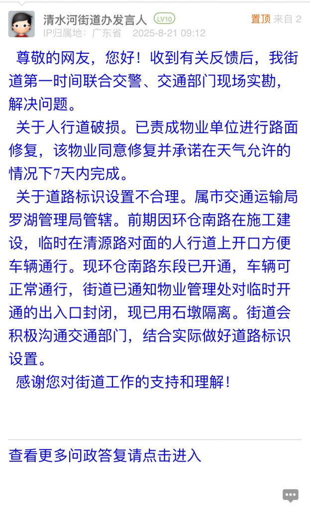 關(guān)于道路標(biāo)識(shí)設(shè)置不合理。屬市交通運(yùn)輸局羅湖管理局管轄。前期因環(huán)倉(cāng)南路在施工建設(shè),臨時(shí)在清源路對(duì)面的人行道上開(kāi)口方便車輛通行?,F(xiàn)環(huán)倉(cāng)南路東段已開(kāi)通,車輛可正常通行,街道已通知物業(yè)管理處對(duì)臨時(shí)開(kāi)通的出入口封閉,現(xiàn)已用石墩隔離。街道會(huì)積極溝通交通部門,結(jié)合實(shí)際做好道路標(biāo)識(shí)設(shè)置。