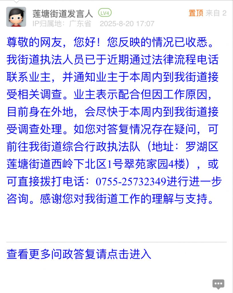 尊敬的網(wǎng)友,您好!您反映的情況已收悉。我街道執(zhí)法人員已于近期通過(guò)法律流程電話聯(lián)系業(yè)主,并通知業(yè)主于本周內(nèi)到我街道接受相關(guān)調(diào)查。業(yè)主表示配合但因工作原因,目前身在外地,會(huì)盡快于本周內(nèi)到我街道接受調(diào)查處理。如您對(duì)答復(fù)情況存在疑問(wèn),可前往我街道綜合行政執(zhí)法隊(duì)(地址:羅湖區(qū)蓮塘街道西嶺下北區(qū)1號(hào)翠苑家園4樓),或可直接撥打電話:0755-25732349進(jìn)行進(jìn)一步咨詢。感謝您對(duì)我街道工作的理解與支持。
