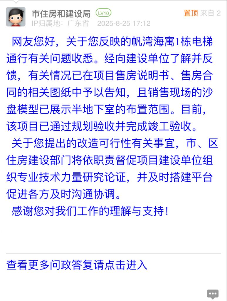 網(wǎng)友您好,關(guān)于您反映的帆灣海寓1棟電梯通行有關(guān)問(wèn)題收悉。經(jīng)向建設(shè)單位了解并反饋,有關(guān)情況已在項(xiàng)目售房說(shuō)明書(shū)、售房合同的相關(guān)圖紙中予以告知,且銷售現(xiàn)場(chǎng)的沙盤模型已展示半地下室的布置范圍。目前,該項(xiàng)目已通過(guò)規(guī)劃驗(yàn)收并完成竣工驗(yàn)收。