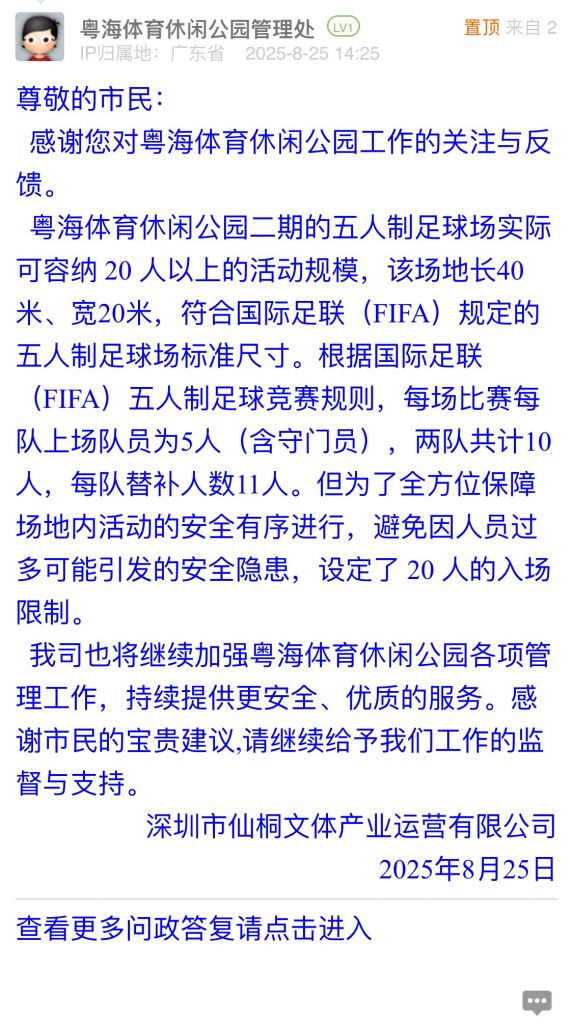 我司也將繼續(xù)加強(qiáng)粵海體育休閑公園各項(xiàng)管理工作,持續(xù)提供更安全、優(yōu)質(zhì)的服務(wù)。感謝市民的寶貴建議,請(qǐng)繼續(xù)給予我們工作的監(jiān)督與支持。