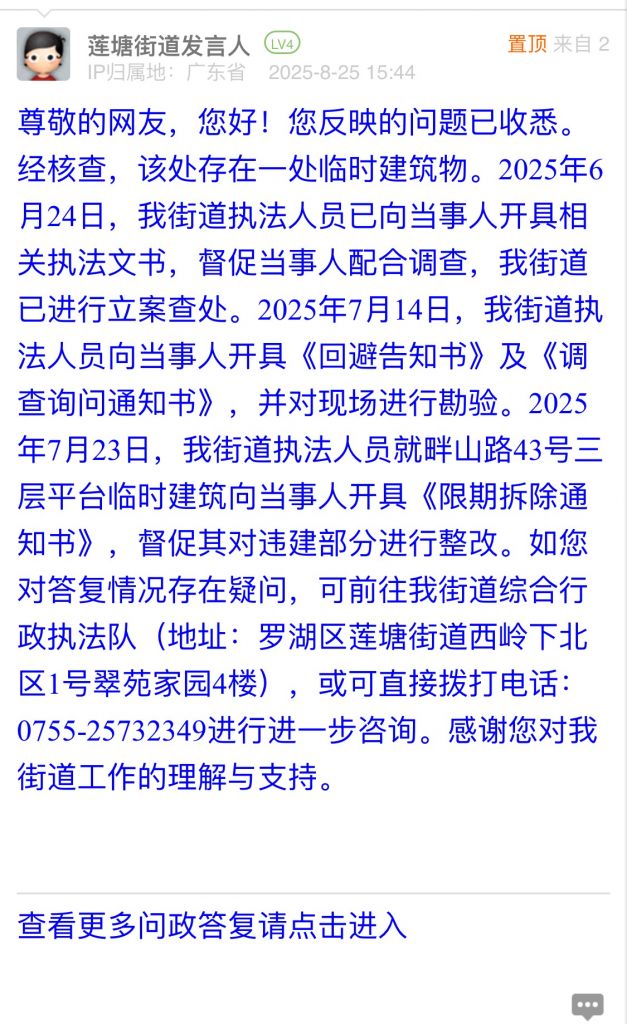 尊敬的網(wǎng)友,您好!您反映的問(wèn)題已收悉。經(jīng)核查,該處存在一處臨時(shí)建筑物。2025年6月24日,我街道執(zhí)法人員已向當(dāng)事人開(kāi)具相關(guān)執(zhí)法文書(shū),督促當(dāng)事人配合調(diào)查,我街道已進(jìn)行立案查處。2025年7月14日,我街道執(zhí)法人員向當(dāng)事人開(kāi)具《回避告知書(shū)》及《調(diào)查詢問(wèn)通知書(shū)》,并對(duì)現(xiàn)場(chǎng)進(jìn)行勘驗(yàn)。2025年7月23日,我街道執(zhí)法人員就畔山路43號(hào)三層平臺(tái)臨時(shí)建筑向當(dāng)事人開(kāi)具《限期拆除通知書(shū)》,督促其對(duì)違建部分進(jìn)行整改。如您對(duì)答復(fù)情況存在疑問(wèn),可前往我街道綜合行政執(zhí)法隊(duì)(地址:羅湖區(qū)蓮塘街道西嶺下北區(qū)1號(hào)翠苑家園4樓),或可直接撥打電話:0755-25732349進(jìn)行進(jìn)一步咨詢。感謝您對(duì)我街道工作的理解與支持。