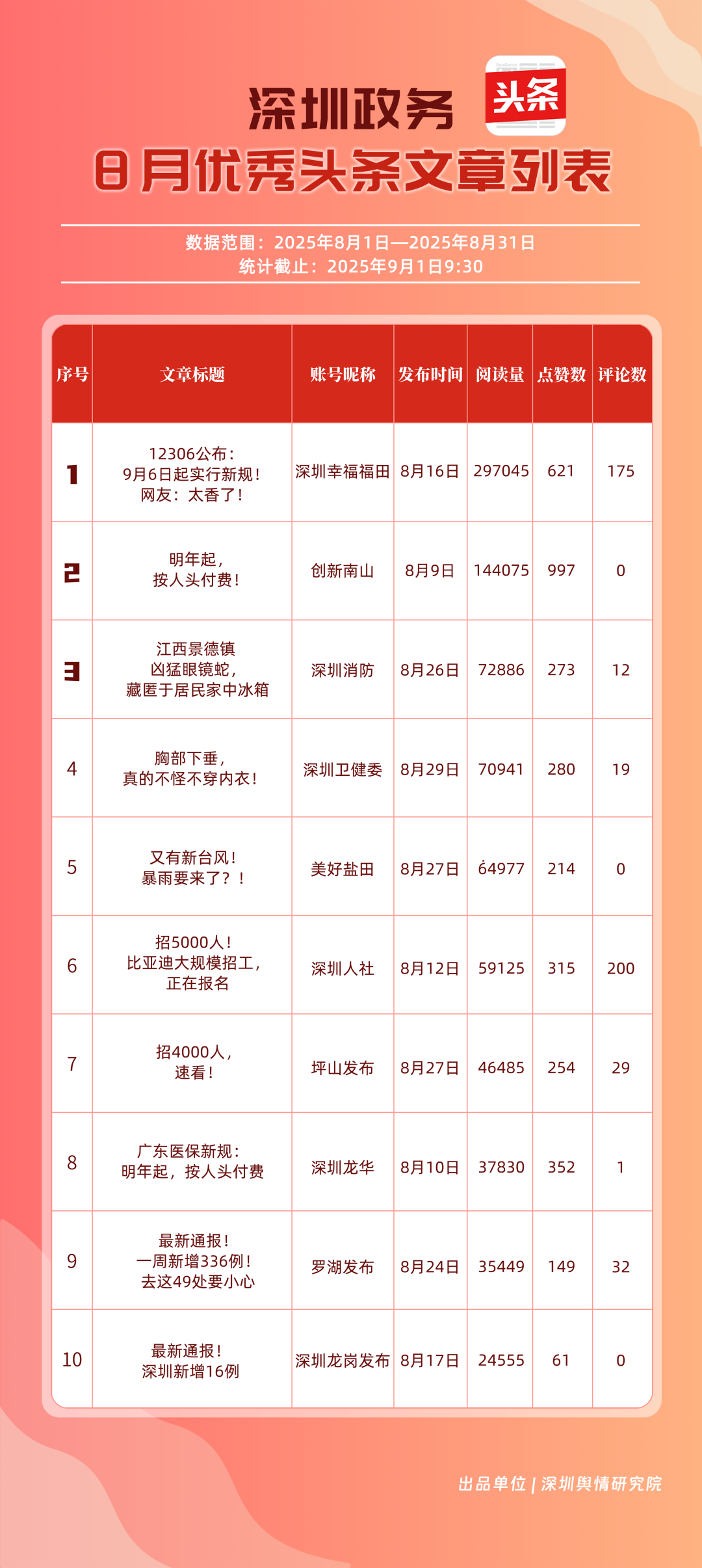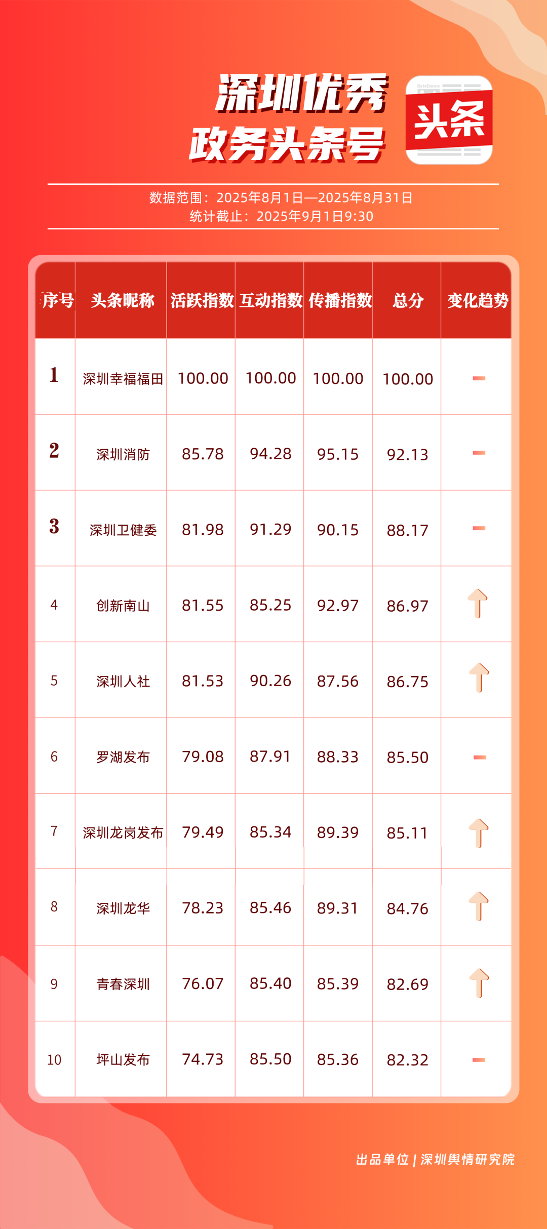 8月,“深圳幸福福田”“深圳消防”“深圳衛(wèi)健委”“創(chuàng)新南山”“深圳人社”“羅湖發(fā)布”“深圳龍崗發(fā)布”“深圳龍華”“青春深圳”“坪山發(fā)布”共10個(gè)政務(wù)頭條號(hào)入選“優(yōu)秀政務(wù)頭條號(hào)”榜單。“深圳幸福福田”憑借持續(xù)優(yōu)異的綜合表現(xiàn),以滿分成績(jī)穩(wěn)居榜單首位,彰顯出強(qiáng)大的政務(wù)傳播力與影響力;“深圳消防”“深圳衛(wèi)健委”則以穩(wěn)定的內(nèi)容質(zhì)量與深厚的民眾基礎(chǔ),持續(xù)為市民提供權(quán)威、及時(shí)的服務(wù)信息,排名穩(wěn)固?!皠?chuàng)新南山”“深圳人社”等上榜賬號(hào)亦表現(xiàn)亮眼,聚焦民生服務(wù)傳遞政策溫度,共同構(gòu)成政務(wù)新媒體矩陣的中堅(jiān)力量,為城市治理與民生服務(wù)注入鮮活動(dòng)能。
