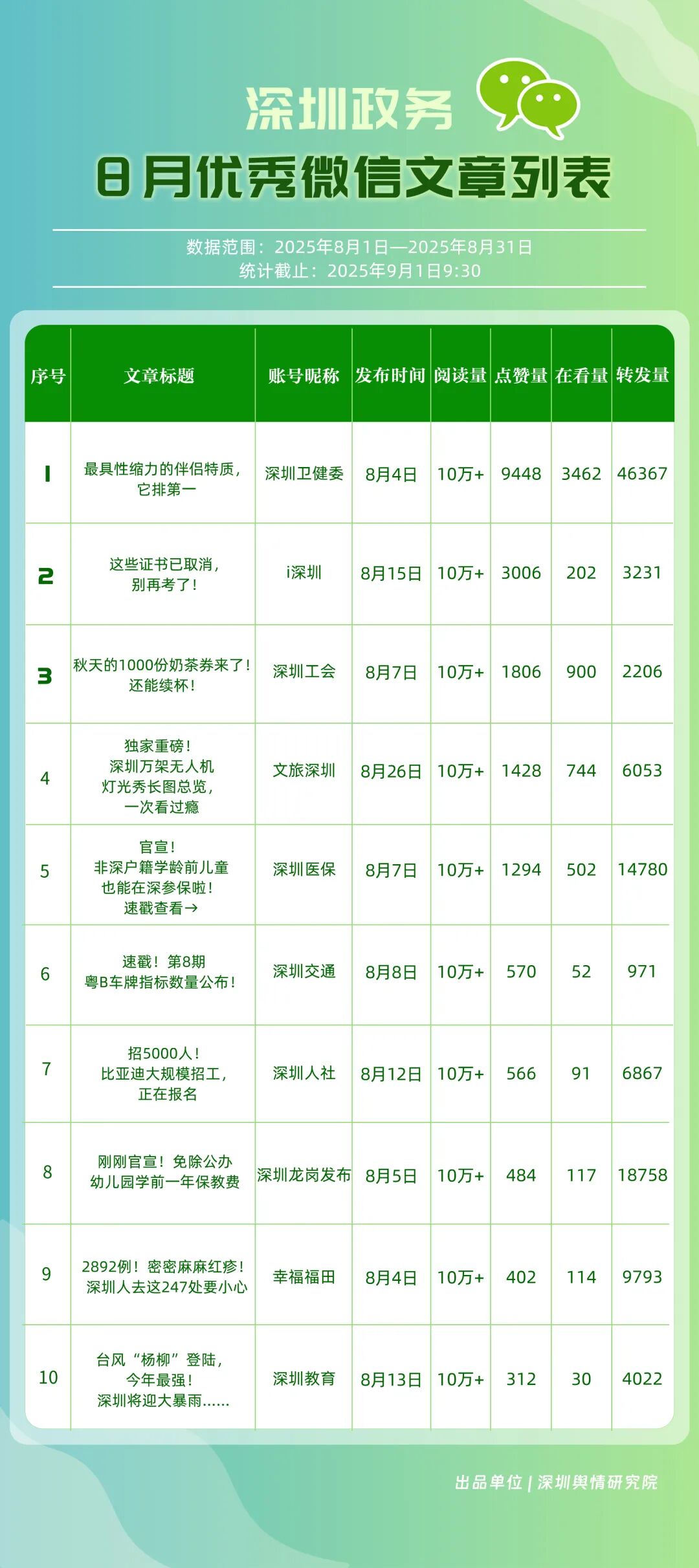 8月,30個(gè)政務(wù)微信公眾號(hào)入選“深圳優(yōu)秀政務(wù)微信公眾號(hào)”榜單,其中包括“深圳衛(wèi)健委”“深圳龍崗發(fā)布”“幸福福田”“i深圳”“創(chuàng)新南山”“深圳工會(huì)”“青春深圳”“深圳龍華”“深圳教育”“深圳光明”等。8月,“深圳衛(wèi)健委”66篇推文獲得超10萬(wàn)次閱讀,以滿分位于榜單首位;“深圳龍崗發(fā)布”積極傳遞民生信息,依托區(qū)域活動(dòng)開展宣傳,推動(dòng)傳播效果顯著提升,位居第二;“幸福福田”關(guān)注區(qū)域發(fā)展動(dòng)態(tài),排名第三?!癷深圳”“創(chuàng)新南山”“深圳工會(huì)”“青春深圳”等政務(wù)賬號(hào)在信息發(fā)布中不斷提升內(nèi)容豐富性,深耕優(yōu)質(zhì)服務(wù),評(píng)分在85分以上。上榜微信公眾號(hào)立足自身特色優(yōu)勢(shì),以精品內(nèi)容為核心競(jìng)爭(zhēng)力,在政務(wù)傳播領(lǐng)域樹立了標(biāo)桿形象,成為兼具影響力與公信力的示范樣本。