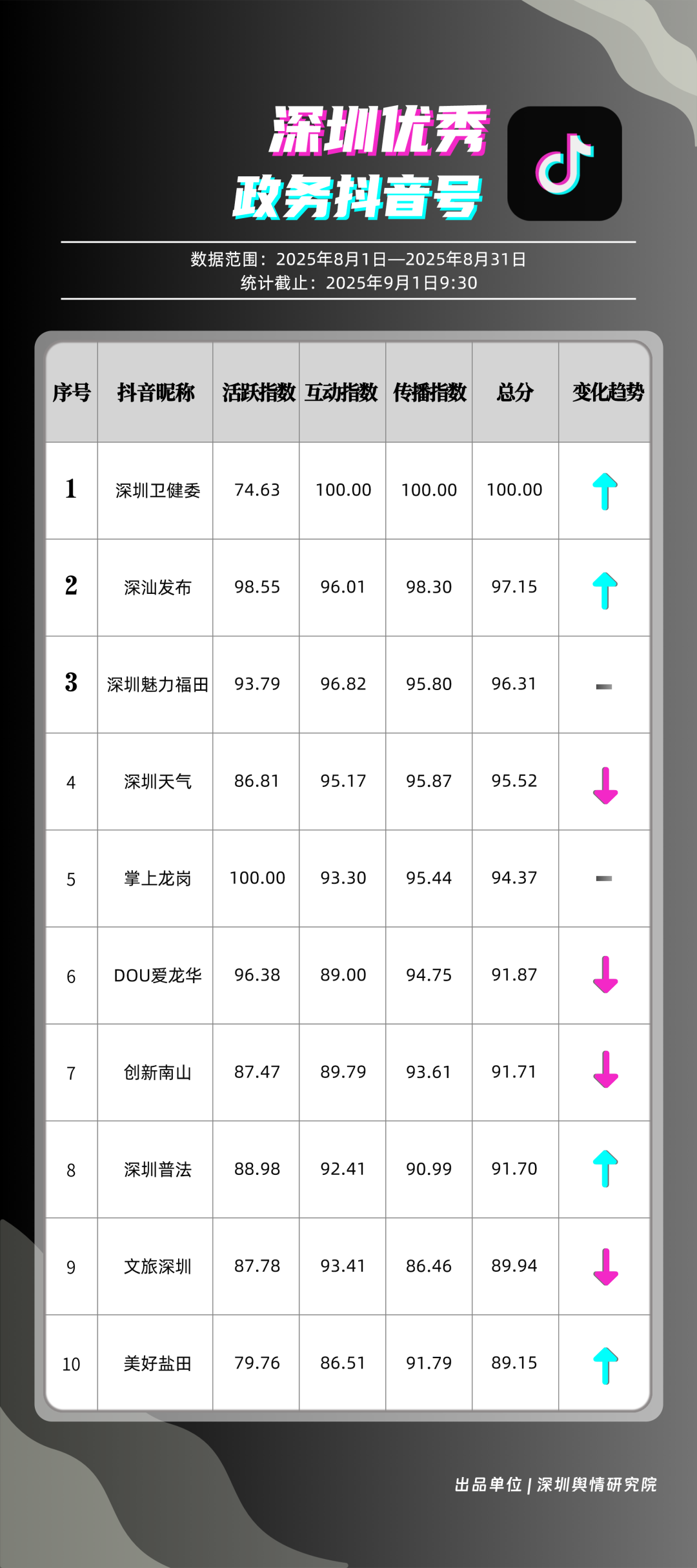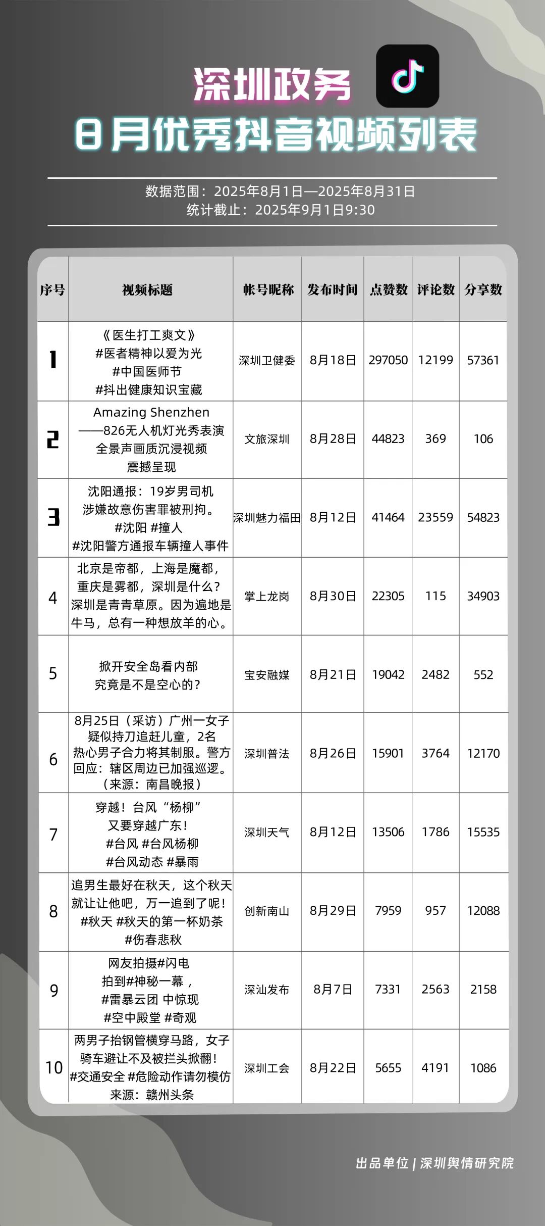 8月,“深圳衛(wèi)健委”“深汕發(fā)布”“深圳魅力福田”“深圳天氣”“掌上龍崗”“DOU愛龍華”“創(chuàng)新南山”“深圳普法”“文旅深圳”“美好鹽田”共10個(gè)政務(wù)抖音號(hào)獲得“優(yōu)秀政務(wù)抖音號(hào)”稱號(hào)?!吧钲谛l(wèi)健委”內(nèi)容吸引大量網(wǎng)民關(guān)注,4條視頻累計(jì)獲得超50萬(wàn)次點(diǎn)贊,排名從上期的第九名上升至第一名;“深汕發(fā)布”憑借較高的傳播指數(shù)評(píng)分,位列第二名,排名有所上升?!吧钲邝攘ΩL铩薄吧钲谔鞖狻钡荣~號(hào)緊隨其后,得分均在95分左右。上榜的優(yōu)秀政務(wù)抖音號(hào)深耕優(yōu)質(zhì)創(chuàng)作,精準(zhǔn)把握網(wǎng)民興趣點(diǎn),使作品收獲高點(diǎn)贊、高轉(zhuǎn)發(fā),推動(dòng)評(píng)論區(qū)形成良性互動(dòng)氛圍,以優(yōu)秀內(nèi)容提升政務(wù)傳播效能。