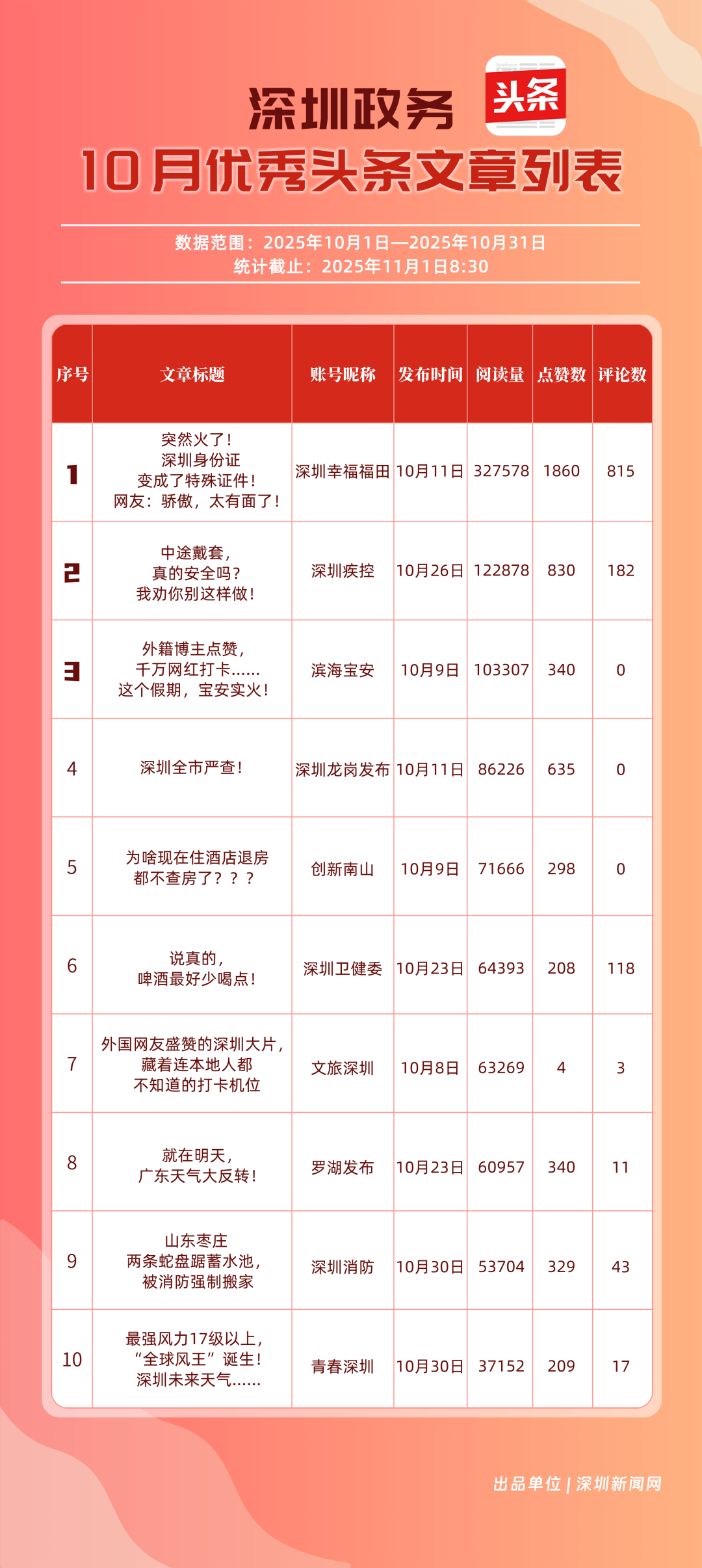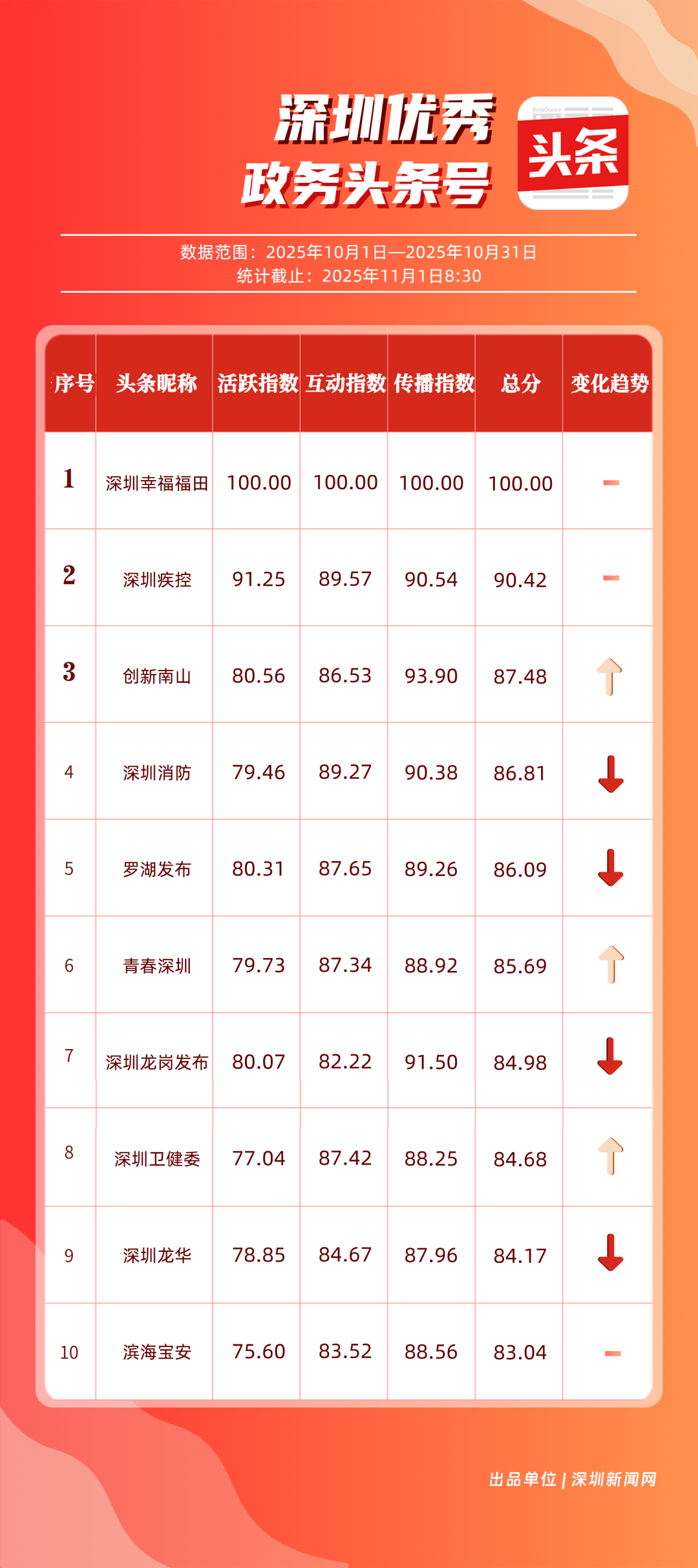 10月,“深圳幸福福田”“深圳疾控”“創(chuàng)新南山”“深圳消防”“羅湖發(fā)布”“青春深圳”“深圳龍崗發(fā)布”“深圳衛(wèi)健委”“深圳龍華”“濱海寶安”共10個政務(wù)頭條號入選“優(yōu)秀政務(wù)頭條號”榜單。“深圳幸福福田”在活躍、互動、傳播均收獲較好成果,蟬聯(lián)榜首;“深圳疾控”得分超90分,持續(xù)發(fā)布民生健康類內(nèi)容,為市民健康保駕護(hù)航;“創(chuàng)新南山”內(nèi)容創(chuàng)作緊扣民生與區(qū)域特色,位列榜單第三名?!吧钲谙馈薄傲_湖發(fā)布”等賬號也位列榜單前列,成為區(qū)域政務(wù)新媒體內(nèi)容創(chuàng)新、信息傳遞的標(biāo)桿。