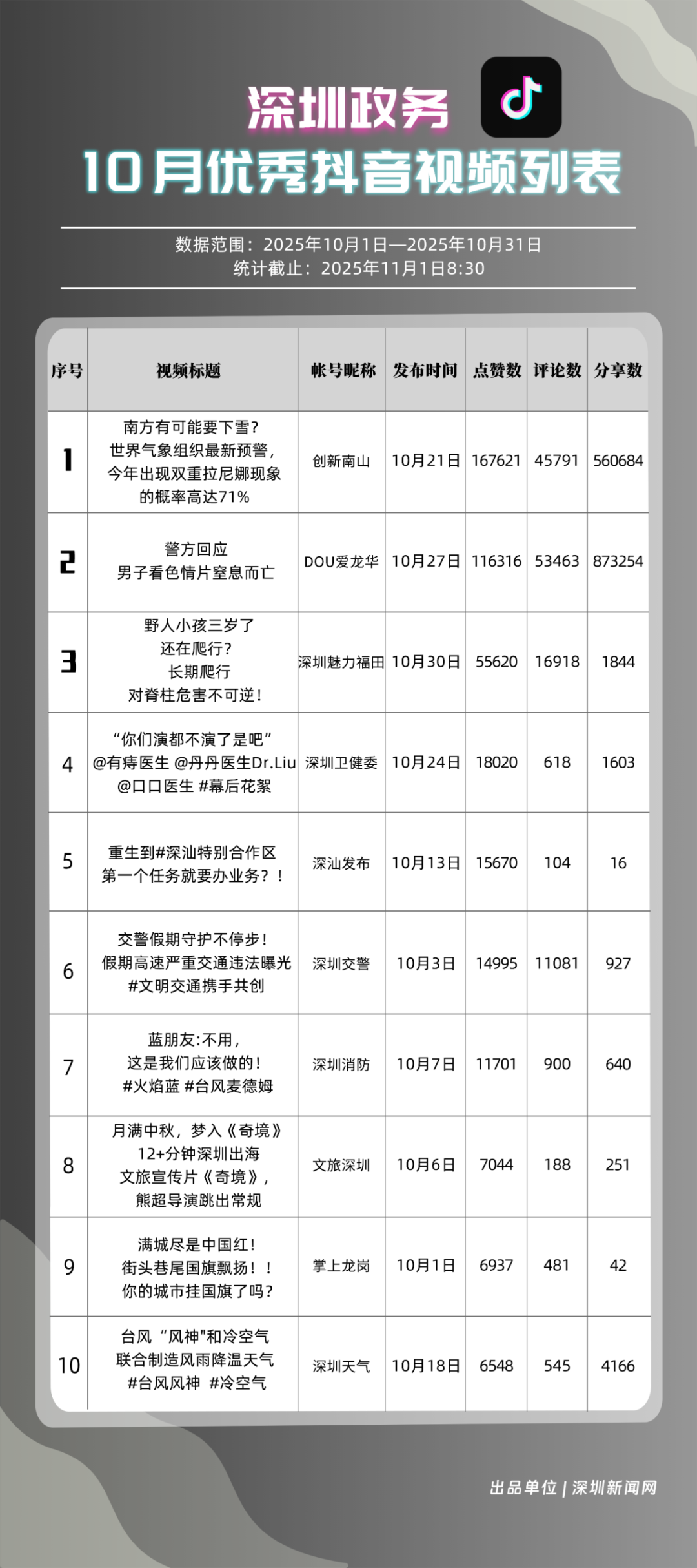 10月,獲得“優(yōu)秀政務(wù)抖音號”稱號的是“創(chuàng)新南山”“DOU愛龍華”“深圳魅力福田”“深汕發(fā)布”“深圳天氣”“掌上龍崗”“青春深圳”“深圳普法”“深圳交警”“深圳消防”?!皠?chuàng)新南山”以總分100分居于榜首,展現(xiàn)出其內(nèi)容創(chuàng)作對用戶的強(qiáng)大吸引力與傳播力;“DOU愛龍華”與“深圳魅力福田”分別位列第二、三位,得分在95分左右,排名較上期有所上升。“深汕發(fā)布”“深圳天氣”“掌上龍崗”等賬號得分均在90分以上,以年輕化表達(dá)展示實(shí)用信息,也收獲較好互動、傳播成績。