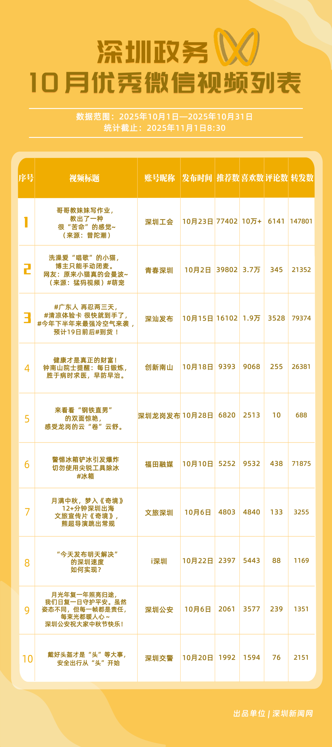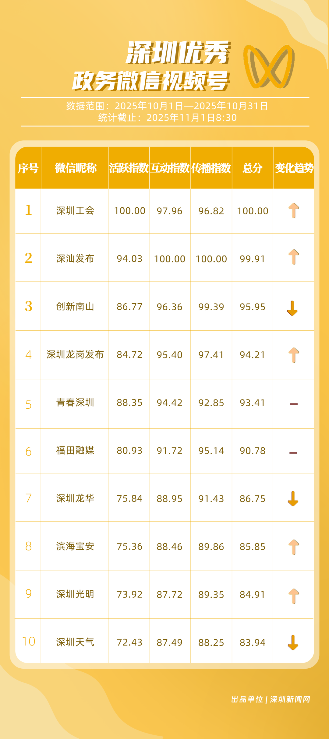 2025年10月期《深圳優(yōu)秀政務(wù)新媒體矩陣》正式發(fā)布,上榜矩陣以深度創(chuàng)新的傳播思路與精細(xì)化的服務(wù)持續(xù)領(lǐng)跑,為政務(wù)新媒體行業(yè)貢獻(xiàn)了可復(fù)制的實(shí)踐經(jīng)驗(yàn),深化政務(wù)信息與公眾喜好的精準(zhǔn)對接,為深圳政務(wù)新媒體高質(zhì)量發(fā)展注入新動能與新活力。