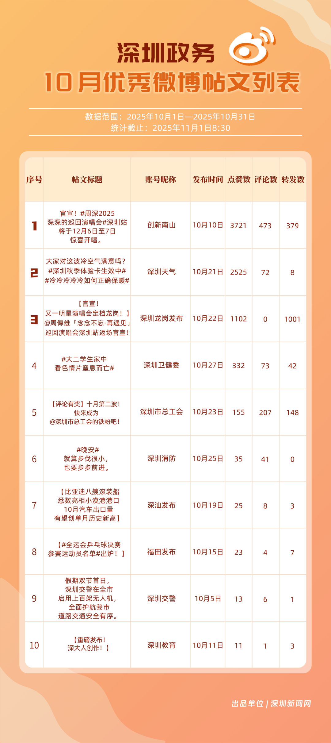 10月,20個賬號入選“優(yōu)秀政務(wù)微博號”榜單,其中包括:“深圳天氣”“深圳龍崗發(fā)布”“深圳市總工會”“深圳消防”“創(chuàng)新南山”“福田發(fā)布”“深圳衛(wèi)健委”“深汕發(fā)布”“深圳應(yīng)急管理”“深圳公安”等。其中,“深圳天氣”高頻、及時(shí)地發(fā)布天氣相關(guān)內(nèi)容,其中多篇關(guān)于“冷空氣”“入秋”帖文收獲較好互動和傳播效果,以100分位列榜單首位;“深圳龍崗發(fā)布”總分97.37分,居于榜單第二,其有關(guān)演唱會定檔、卷尺哥等內(nèi)容的帖文獲得較好數(shù)據(jù);“深圳市總工會”關(guān)注職工日常生活,以97.03分居于榜單第三?!吧钲谙馈薄皠?chuàng)新南山”等微博賬號也通過各自的特色內(nèi)容,展現(xiàn)深圳城市治理、民生服務(wù)的溫度。