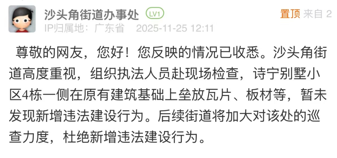 優(yōu)化建議:針對(duì)網(wǎng)民投訴的小區(qū)違建問題,街道回應(yīng)僅以“未發(fā)現(xiàn)新增違法建設(shè)行為”簡單回復(fù),尚有完善空間。若該點(diǎn)位存在建設(shè)年代久遠(yuǎn)、權(quán)屬界定模糊、涉及多主體協(xié)調(diào)等客觀難點(diǎn),可適度說明,并在回應(yīng)中補(bǔ)充核查細(xì)節(jié),說明后續(xù)處置方向與階段計(jì)劃,讓回應(yīng)更具可信度和實(shí)操性,回應(yīng)市民對(duì)“依法履職”的期待。
