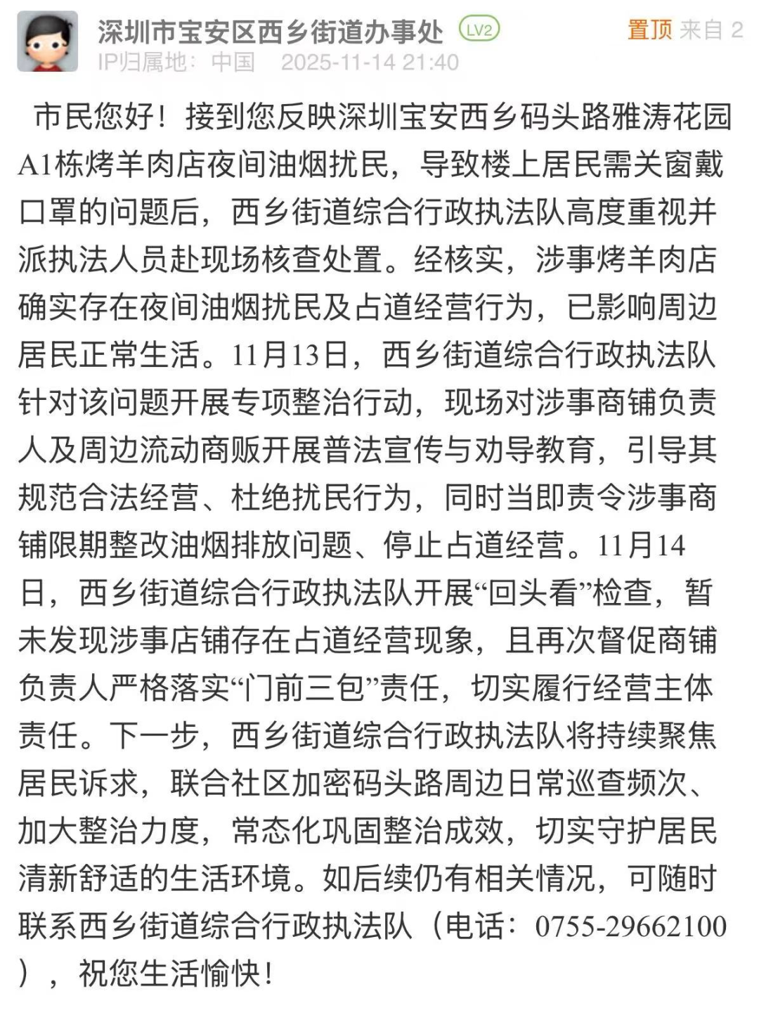 案例點(diǎn)評(píng):接到市民反映后,街道迅速響應(yīng),當(dāng)日開展核查,次日回應(yīng)進(jìn)展,處置高效。針對(duì)涉事店鋪油煙問題,執(zhí)法隊(duì)不僅現(xiàn)場開展普法勸導(dǎo),責(zé)令商鋪限期整改,更在次日開展“回頭看”檢查,及時(shí)跟進(jìn)整改進(jìn)度、壓實(shí)經(jīng)營主體責(zé)任?;貞?yīng)中,街道明確下一步將聯(lián)合社區(qū)加密日常巡查、加大整治力度,常態(tài)化鞏固整治成效,體現(xiàn)出緊盯民生痛點(diǎn)、深耕基層精細(xì)化治理、全力守護(hù)居民舒適生活環(huán)境的決心。