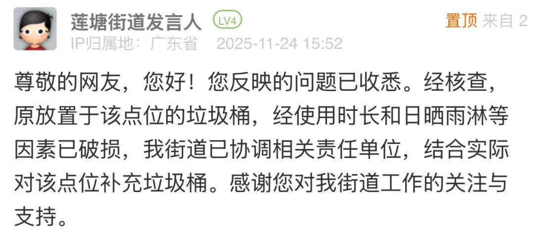 案例點(diǎn)評(píng):針對(duì)市民反映“垃圾桶無故取消”的問題,街道辦在3小時(shí)內(nèi)完成核查,清晰說明垃圾桶搬離原因,同時(shí)迅速協(xié)調(diào)相關(guān)責(zé)任單位,結(jié)合實(shí)際情況明確將為該點(diǎn)位補(bǔ)充垃圾桶,切實(shí)解決群眾投放垃圾的剛需。此次處置迅速有效,既體現(xiàn)了直面民生訴求、不推諉不拖延的工作態(tài)度,也展現(xiàn)了精細(xì)化治理能力,為后續(xù)環(huán)衛(wèi)設(shè)施維護(hù)和民生需求響應(yīng)提供了范本。