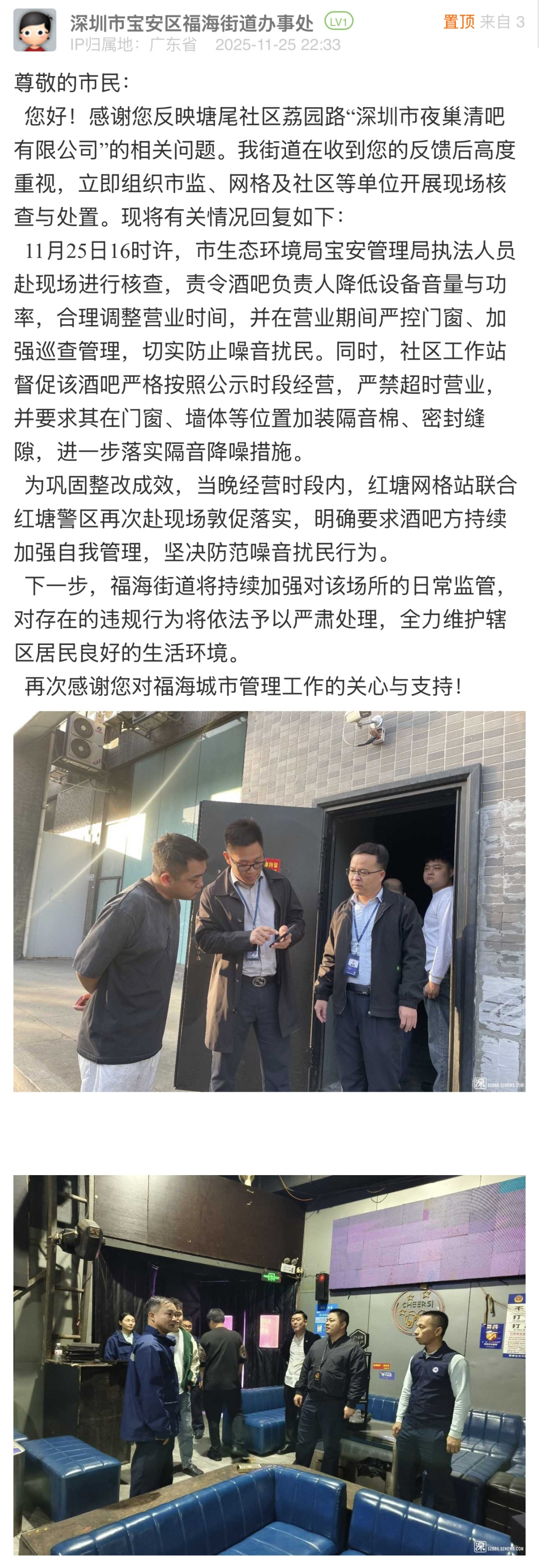 案例點(diǎn)評(píng):針對(duì)市民反映的問題,福海街道辦與市生態(tài)環(huán)境局寶安管理局快速響應(yīng)、協(xié)同處置,在24小時(shí)內(nèi)組織工作人員開展線下核查,現(xiàn)場責(zé)令店鋪整改,嚴(yán)禁其超時(shí)營業(yè),并要求加裝隔音棉、密封縫隙,加強(qiáng)降噪。在發(fā)出整改要求當(dāng)晚,網(wǎng)格站聯(lián)合警區(qū)再次到現(xiàn)場復(fù)查,督促整改要求落實(shí),同時(shí)公開執(zhí)法圖片向公眾反饋處置進(jìn)展,有效回應(yīng)市民關(guān)切,體現(xiàn)了務(wù)實(shí)高效的工作作風(fēng)。