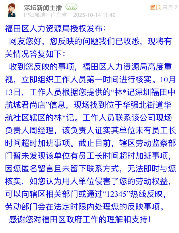 優(yōu)化建議:網(wǎng)民投訴的核心有兩點,一是外包公司無勞務(wù)派遣資質(zhì)卻代繳社保、發(fā)放工資,二是工作時間過長。福田區(qū)人力資源局雖回應(yīng)已核實涉事餐飲單位“無長時間超時加班”,但對網(wǎng)民反映的外包公司無資質(zhì)這一關(guān)鍵問題未作回應(yīng)。此情況反映出,資質(zhì)核查工作亟需加強,如對相關(guān)餐飲單位開展用工合規(guī)專項檢查,以精準(zhǔn)舉措解決無資質(zhì)外包這一核心痛點,提升市民對勞動者權(quán)益保障工作的認(rèn)可度。
