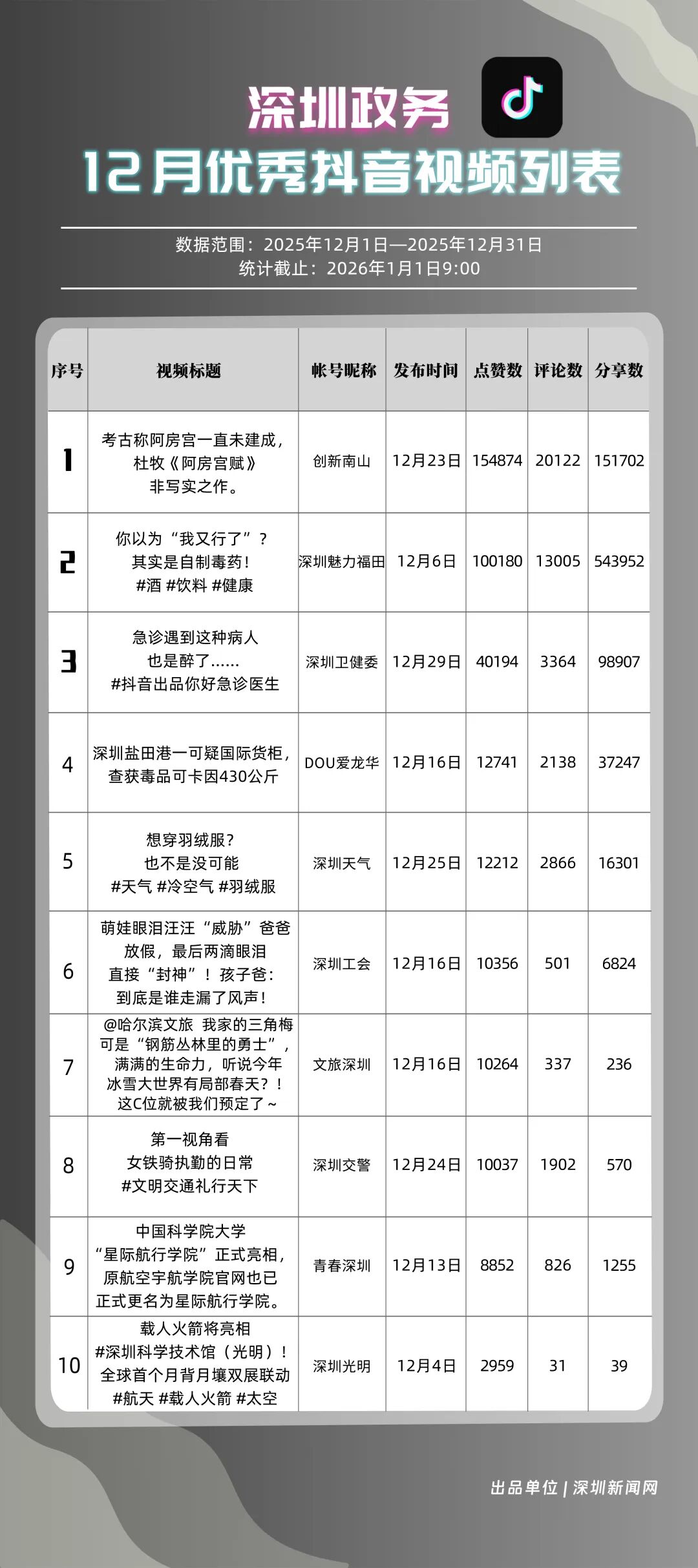 12月,獲得“優(yōu)秀政務(wù)抖音號(hào)”稱號(hào)的是“創(chuàng)新南山”“深圳魅力福田”“深圳衛(wèi)健委”“深圳天氣”“DOU愛龍華”“青春深圳”“深圳交警”“深汕發(fā)布”“深圳工會(huì)”“文旅深圳”?!皠?chuàng)新南山”積極傳播傳統(tǒng)文化、民生健康等多元內(nèi)容,當(dāng)月視頻總點(diǎn)贊數(shù)超120萬(wàn),位居榜首;“深圳魅力福田”內(nèi)容激發(fā)用戶主動(dòng)轉(zhuǎn)發(fā)熱情,在傳播指數(shù)評(píng)分較高,位列第二名;“深圳衛(wèi)健委”聚焦民生健康話題,產(chǎn)出高質(zhì)量視頻內(nèi)容,排名上升至第三?!吧钲谔鞖狻薄癉OU愛龍華”“青春深圳”等賬號(hào)評(píng)分均在86分以上,反映出賬號(hào)的內(nèi)容質(zhì)量與用戶粘性突出。上榜政務(wù)抖音號(hào)在短視頻傳播賽道持續(xù)深耕,憑借精準(zhǔn)的內(nèi)容定位與創(chuàng)新的傳播手法,成功打造出極具影響力的政務(wù)傳播矩陣。