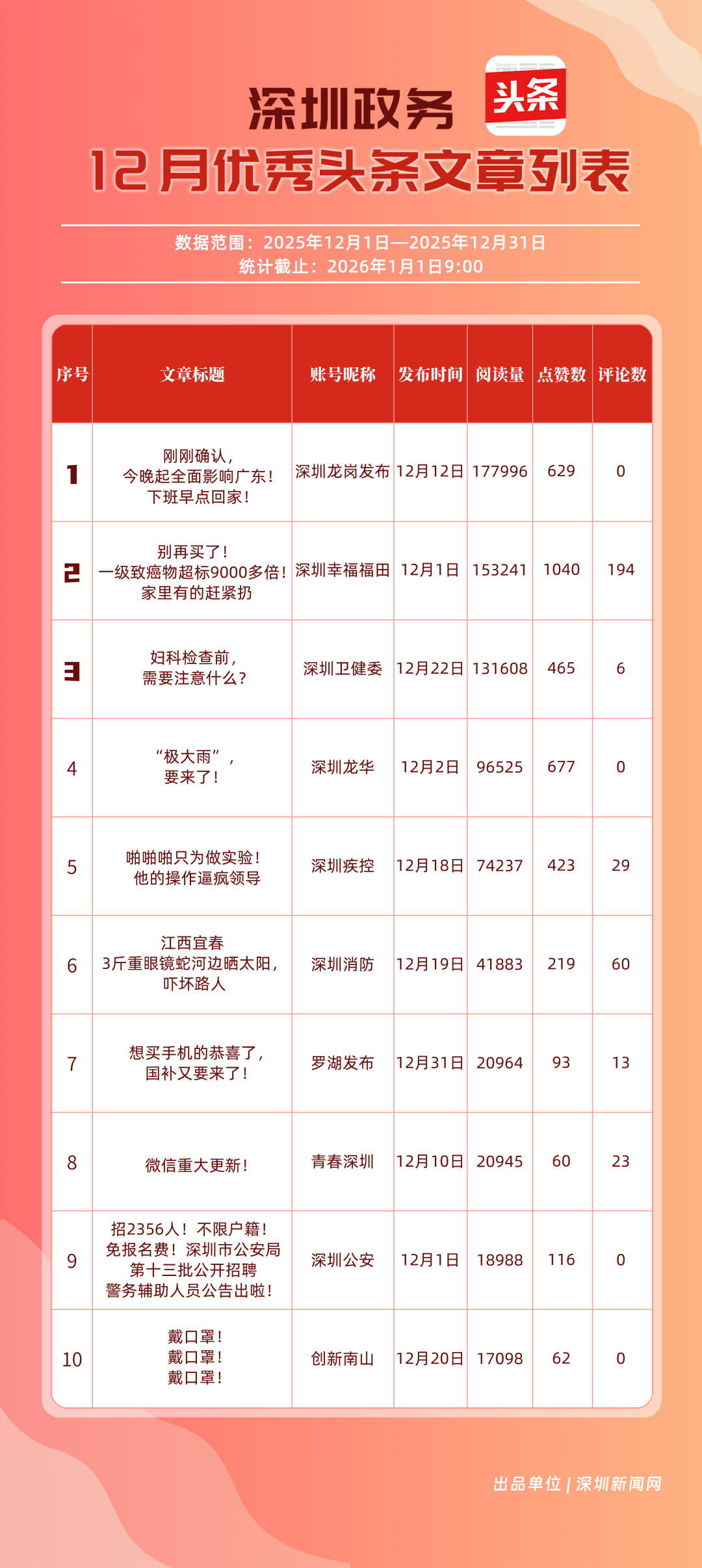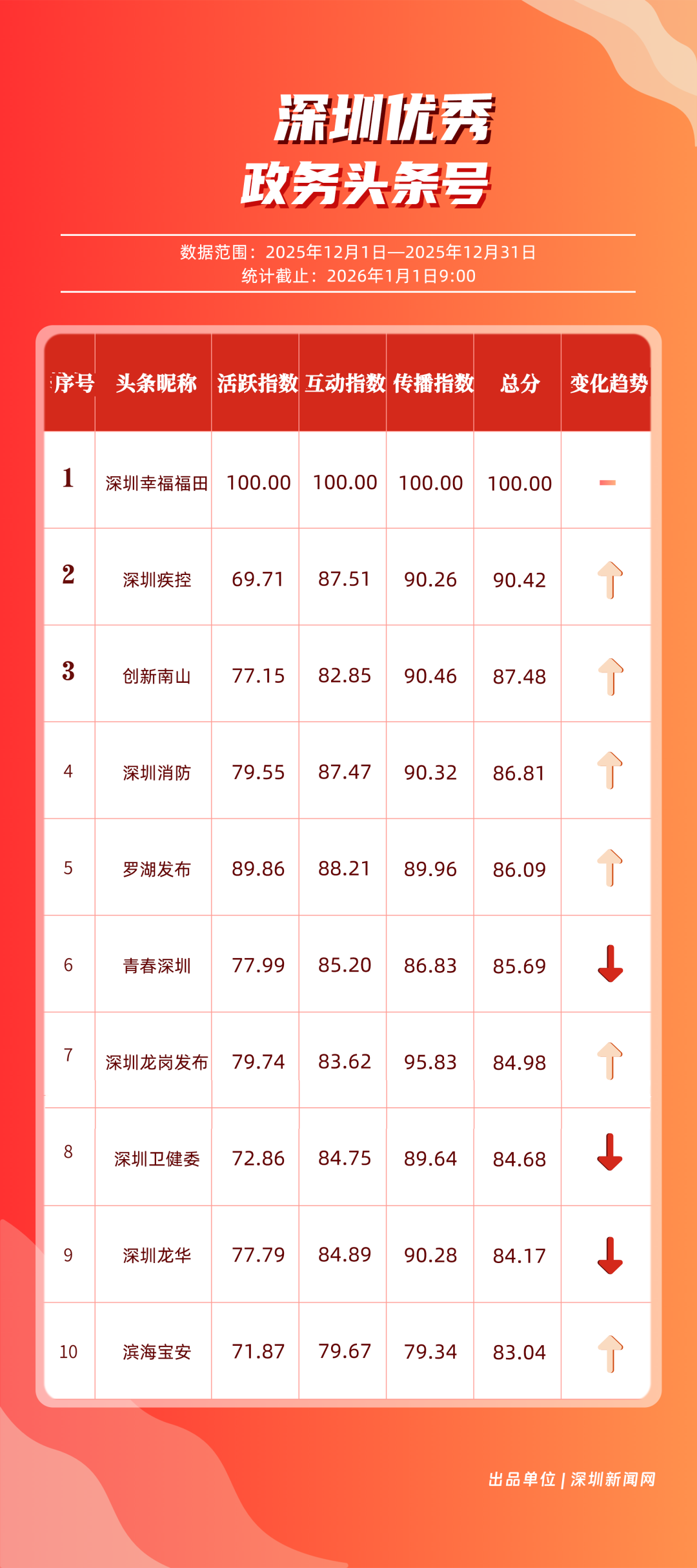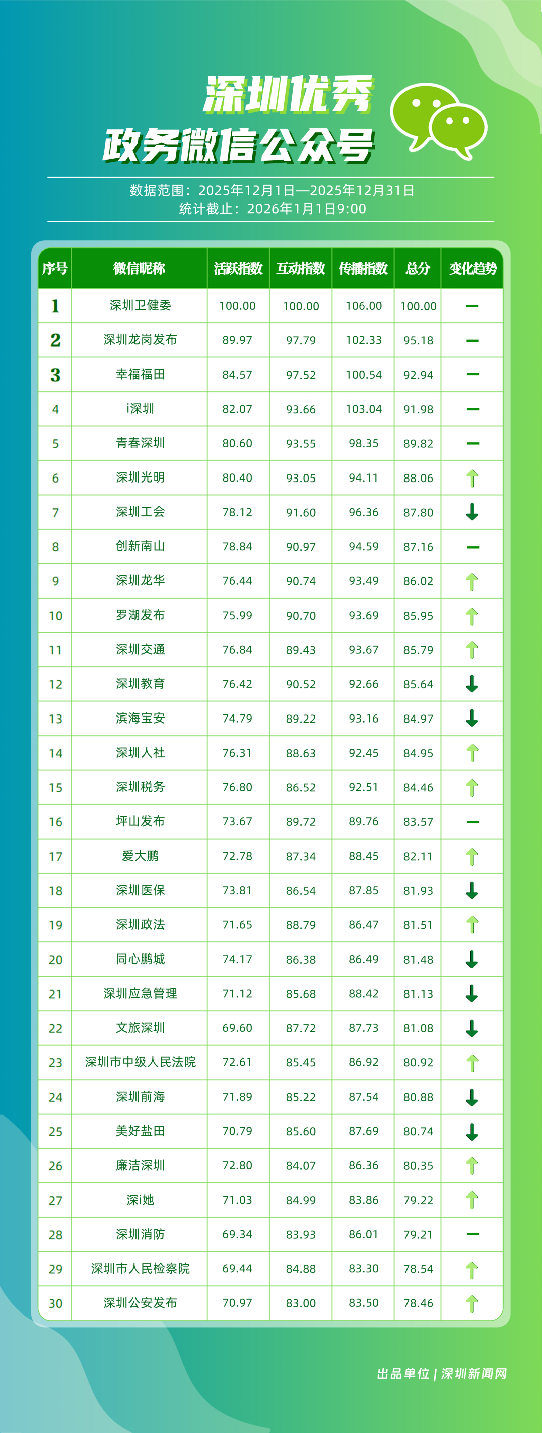 12月,“深圳衛(wèi)健委”“深圳龍崗發(fā)布”“幸福福田”“i深圳”“青春深圳”“深圳光明”“深圳工會(huì)”“創(chuàng)新南山”“深圳龍華”“羅湖發(fā)布”等30個(gè)政務(wù)微信公眾號(hào)榮登“深圳優(yōu)秀政務(wù)微信公眾號(hào)”榜單。12月榜單中,頭部政務(wù)賬號(hào)優(yōu)勢(shì)穩(wěn)固,腰部賬號(hào)競(jìng)爭(zhēng)激烈?!吧钲谛l(wèi)健委”延續(xù)強(qiáng)勁表現(xiàn),在活躍、互動(dòng)、傳播維度均斬獲滿分,60余篇文章閱讀超10萬(wàn),蟬聯(lián)榜首;“深圳龍崗發(fā)布”在互動(dòng)、傳播方面表現(xiàn)亮眼,穩(wěn)居榜單第二;“幸福福田”也在互動(dòng)、傳播方面具備一定優(yōu)勢(shì),以穩(wěn)定的內(nèi)容輸出與用戶口碑,居于榜單第三?!吧钲诠饷鳌薄吧钲邶埲A”“羅湖發(fā)布”等政務(wù)賬號(hào)不斷拓展信息發(fā)布維度、深化服務(wù)場(chǎng)景打造,排名較上期有所提升。上榜微信公眾號(hào)以高質(zhì)量?jī)?nèi)容為核心競(jìng)爭(zhēng)力,在政務(wù)傳播賽道持續(xù)發(fā)力,為推動(dòng)政務(wù)信息公開、服務(wù)民生需求搭建了高效的溝通橋梁。