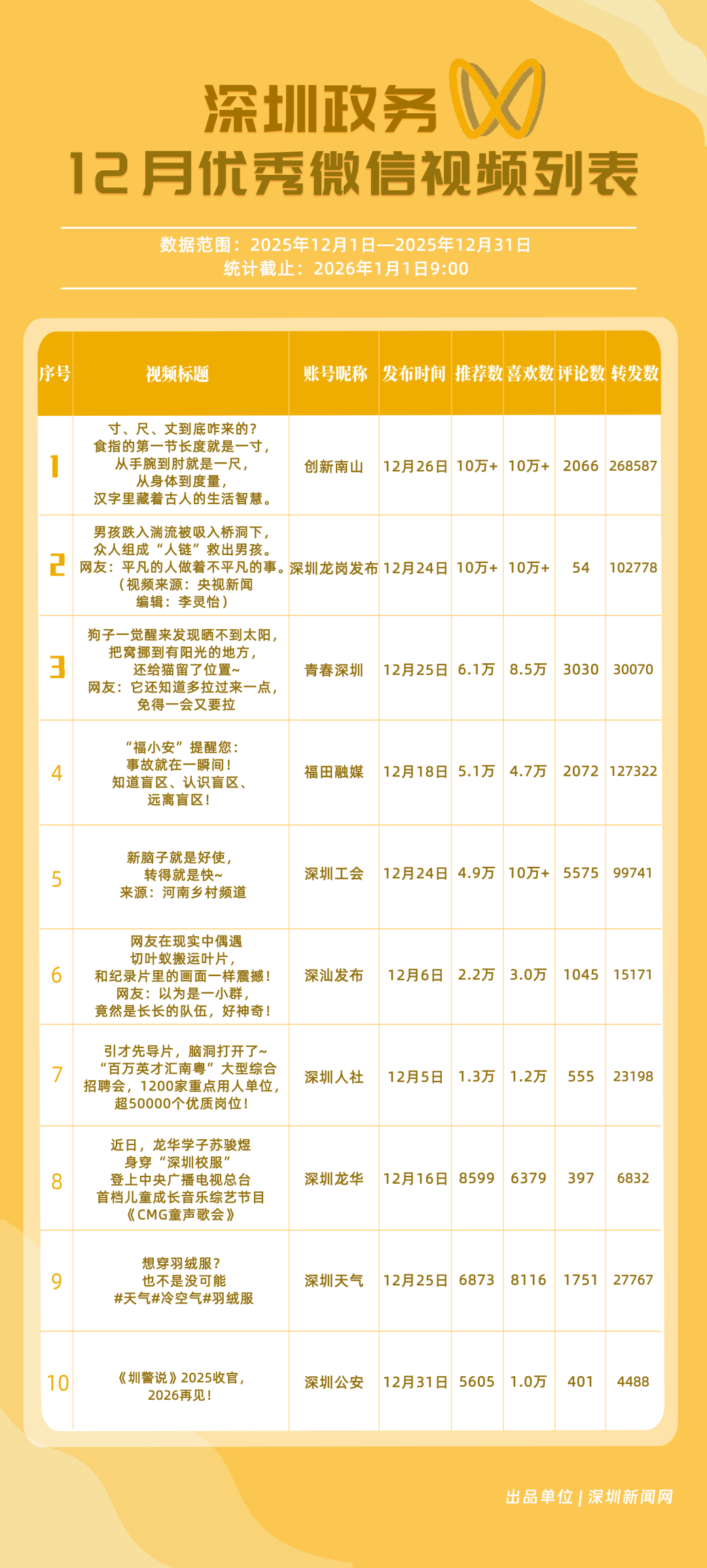 12月,“創(chuàng)新南山”“深圳工會(huì)”“青春深圳”“福田融媒”“深圳龍崗發(fā)布”“深汕發(fā)布”“深圳天氣”“深圳光明”“深圳龍華”“深圳人社”榮獲“優(yōu)秀政務(wù)微信視頻號(hào)”稱號(hào)。“創(chuàng)新南山”活躍指數(shù)、傳播指數(shù)均獲滿分,月作品總轉(zhuǎn)發(fā)量超70萬(wàn),領(lǐng)跑榜單;“深圳工會(huì)”積極發(fā)布熱點(diǎn)、民生類內(nèi)容,精準(zhǔn)對(duì)接市民需求,排名上升至第二名;“青春深圳”互動(dòng)指數(shù)超98分,以高互動(dòng)量位列榜單第三名?!案L锶诿健薄吧钲邶垗彴l(fā)布”兩賬號(hào)立足區(qū)域特色深耕內(nèi)容,得分超90分。上榜微信視頻號(hào)以輕量化短視頻為載體,傳播公眾喜聞樂見的政務(wù)、民生內(nèi)容,打造出兼具傳播力與親和力的政務(wù)宣傳新名片。