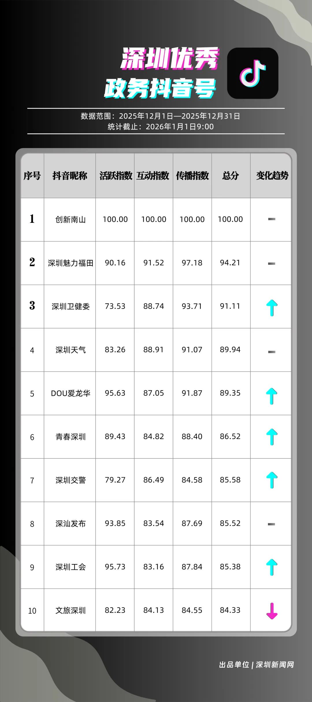 12月,深圳政務(wù)新媒體矩陣持續(xù)深耕內(nèi)容生態(tài),各單位依托平臺(tái)特色深化服務(wù)效能,南山區(qū)、福田區(qū)、市衛(wèi)生健康委員會(huì)、市總工會(huì)、龍崗區(qū)、市氣象局(臺(tái))、光明區(qū)、中國(guó)共產(chǎn)主義青年團(tuán)深圳市委員會(huì)、龍華區(qū)、深汕特別合作區(qū)的新媒體矩陣入選“深圳優(yōu)秀政務(wù)新媒體矩陣”榜單。12月,南山區(qū)新媒體矩陣中,“創(chuàng)新南山”賬號(hào)在抖音平臺(tái)保持高質(zhì)量創(chuàng)作態(tài)勢(shì),單賬號(hào)單月視頻總點(diǎn)贊量突破120萬(wàn),視頻號(hào)平臺(tái)同樣表現(xiàn)亮眼,單月視頻總轉(zhuǎn)發(fā)量超70萬(wàn),憑借雙平臺(tái)滿分的傳播表現(xiàn),位居榜單首位;福田區(qū)新媒體矩陣表現(xiàn)均衡穩(wěn)定,在各平臺(tái)得分均在92分以上,以93.94分的總成績(jī)位列第二;市衛(wèi)生健康委員會(huì)新媒體矩陣在微信公眾號(hào)持續(xù)輸出專業(yè)優(yōu)質(zhì)內(nèi)容,在該平臺(tái)獲得滿分,助力其以92.21分的總分排名第三位。此外,市總工會(huì)、龍崗區(qū)新媒體矩陣總分均超90分,以“各美其美”的發(fā)展態(tài)勢(shì),展現(xiàn)深圳政務(wù)新媒體矩陣的蓬勃生機(jī)。