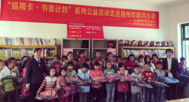 2016年,由深圳農商行發(fā)起的“信用卡公益計劃·書香圖書室”捐贈活動,深入走進廣西壯族自治區(qū)的偏遠山區(qū),為當?shù)剌^為貧困的學校學生送去溫暖。此次活動為當?shù)氐闹写逍W、合林小學及龍降小學捐贈各類圖書共計2217本、文具6665套、書包153個、書桌書柜椅子共115個、體育用品108套,有效地幫助這三所小學建設完整的圖書室,為學生們創(chuàng)造良好的閱讀環(huán)境。[詳細]