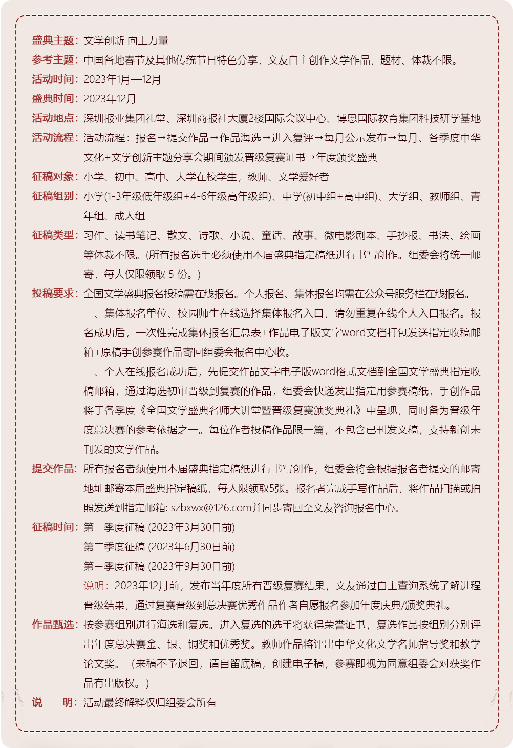 全國文學(xué)盛典2022年度總決賽優(yōu)秀獎獲獎代表合影全國文學(xué)盛典2022年度總決賽優(yōu)秀獎獲獎代表合影全國文學(xué)盛典2022年度總決賽金獎獲獎選手代表合影全國文學(xué)盛典2022年度總決賽銀獎獲獎選手代表合影全國文學(xué)盛典2022年度總決賽銅獎獲獎選手代表合影中華文化文學(xué)創(chuàng)新名師指導(dǎo)獎獲獎代表合影中華文化文學(xué)創(chuàng)新名師指導(dǎo)獎獲獎代表合影2023年度中華文化現(xiàn)行倡導(dǎo)者、特聘鵬城小記者、中華文化文學(xué)創(chuàng)作特長生人才庫入選代表合影優(yōu)秀書香家庭獲獎代表合影獲獎代表李睿頤、張文瑄帶來了精彩的表演中華文化文學(xué)盛典特聘專家獲獎代表合影中華文化文學(xué)盛典名校長獲獎代表合影中華文化創(chuàng)新文學(xué)示范校獲獎代表合影活動現(xiàn)場,“全國文學(xué)盛典名師大講堂”主講嘉賓謝晨為大家?guī)碇黝}講座全國文學(xué)盛典名師大講堂成員、組委會專家委委員劉翔宇深圳市商品交易市場聯(lián)合會執(zhí)行會長劉鴻強(qiáng)致辭中龍華區(qū)教科院附屬學(xué)校校長黃宇慧致辭中全國文學(xué)盛典系列文創(chuàng)平臺聯(lián)合發(fā)起人肖硯寧致辭中與會的師生文友也通過現(xiàn)場的全國文學(xué)盛典年度精彩活動回顧區(qū),一同重溫過往的經(jīng)歷與會的領(lǐng)導(dǎo)嘉賓、師生文友共同走進(jìn)全國文學(xué)盛典年度慶典現(xiàn)場展示區(qū)