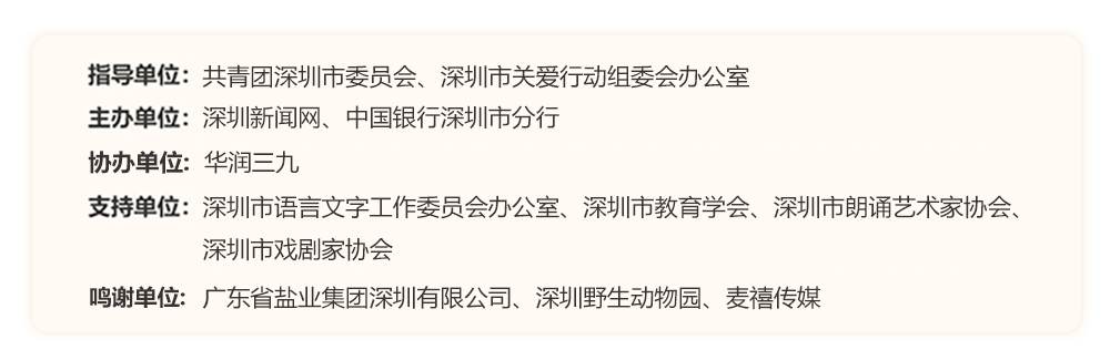 為助力建設(shè)良好的青少年閱讀環(huán)境,激發(fā)學(xué)生閱讀興趣,倡導(dǎo)親子閱讀,共建和諧家庭關(guān)系。2022年,“誰(shuí)是故事大王·第六季”在共青團(tuán)深圳市委員會(huì)、深圳市關(guān)愛(ài)行動(dòng)組委會(huì)辦公室的指導(dǎo)下再出發(fā)?;顒?dòng)由深圳新聞網(wǎng)、中國(guó)銀行深圳市分行主辦,華潤(rùn)三九協(xié)辦,得到了廣東省鹽業(yè)集團(tuán)深圳有限公司、深圳野生動(dòng)物園、麥禧傳媒的大力支持。更長(zhǎng)的活動(dòng)周期,更豐富的參與形式,更專(zhuān)業(yè)的賽制,等你來(lái)解鎖與挑戰(zhàn)!讓閱讀成為最動(dòng)人的風(fēng)景,讓故事的魅力感動(dòng)深圳。說(shuō)明:所有參賽者報(bào)名成功后,均承認(rèn)并允許主辦方將個(gè)人參加本次活動(dòng)的照片或視頻相關(guān)資料刊發(fā)在各類(lèi)媒體雜志報(bào)紙上,用于活動(dòng)宣傳。
